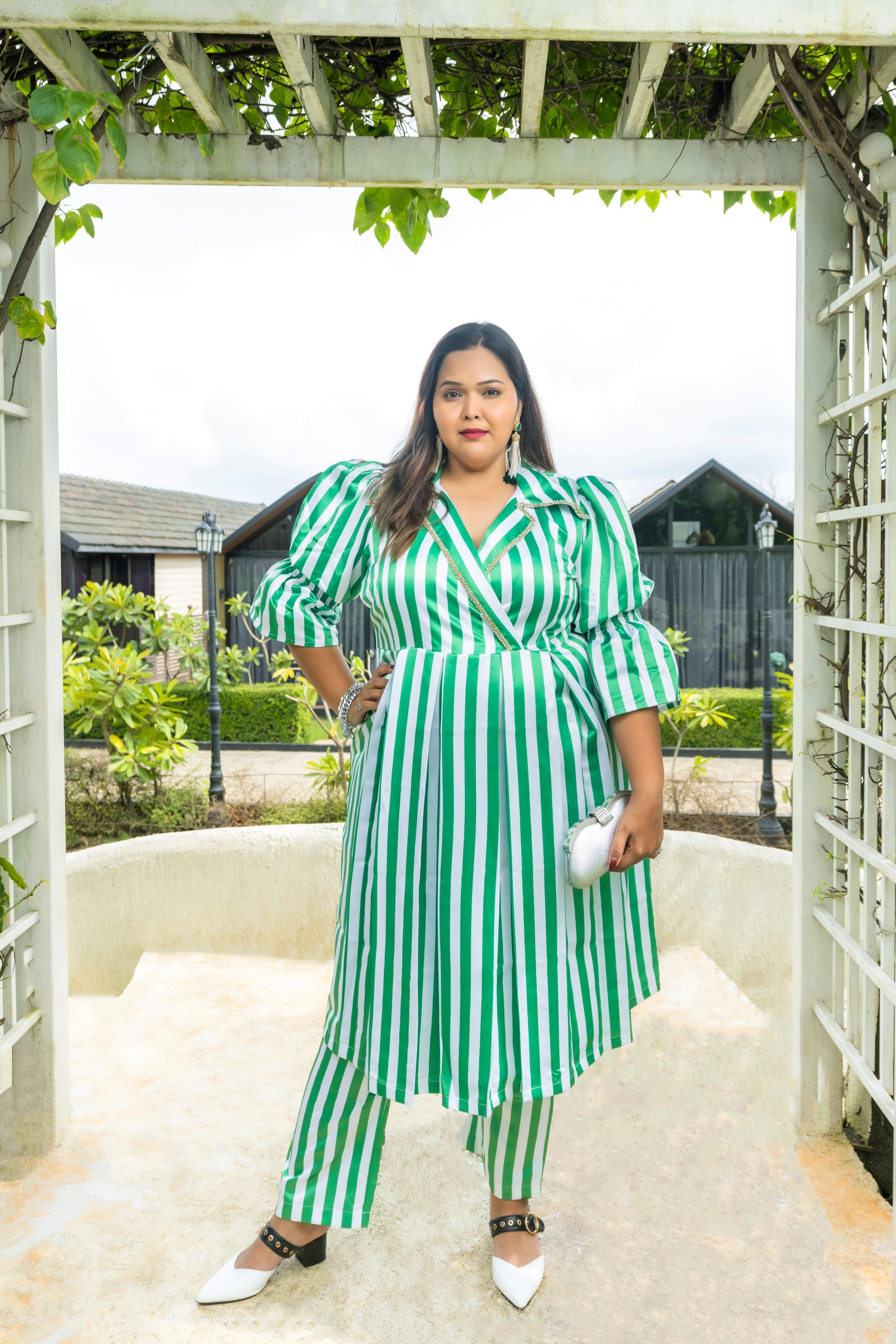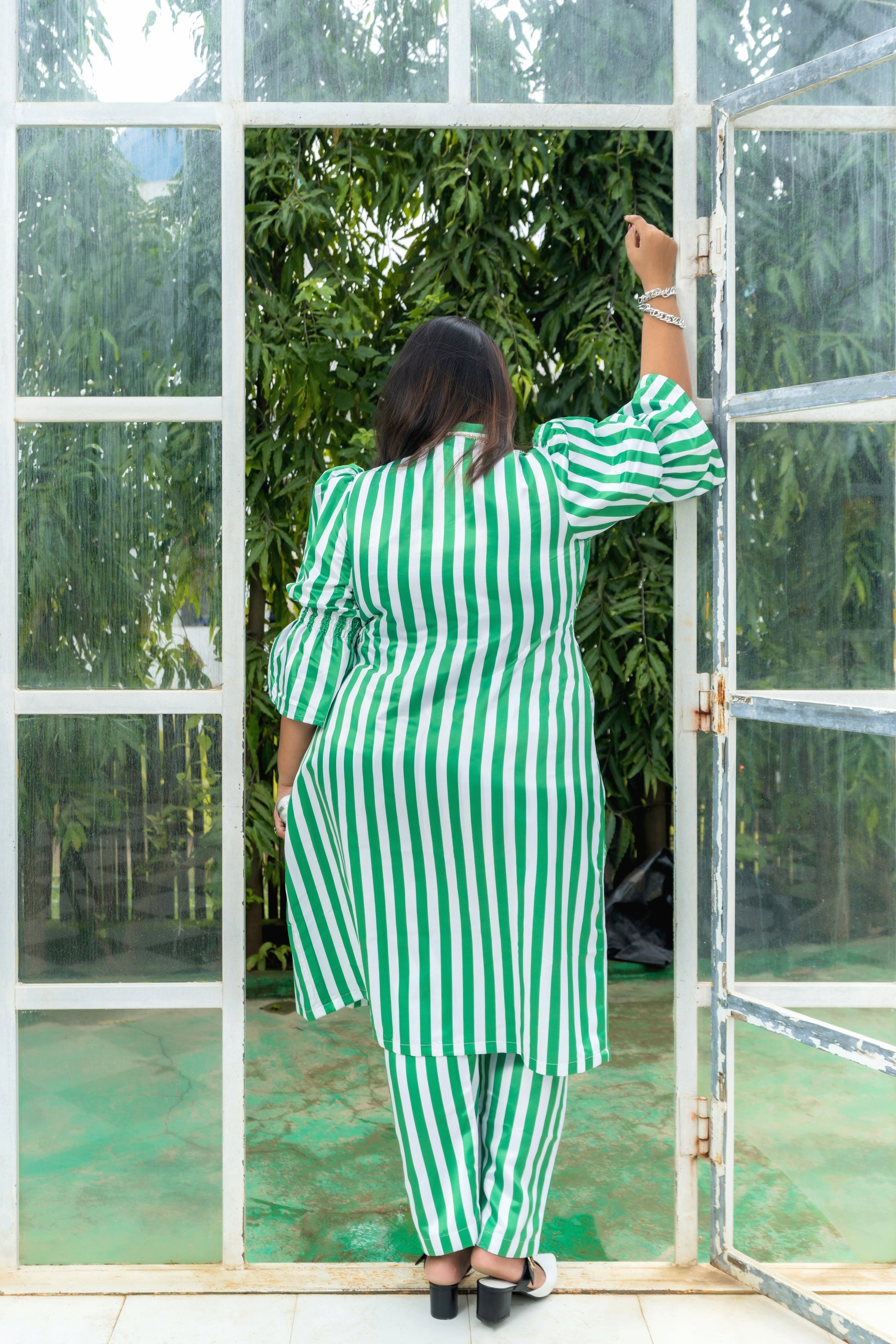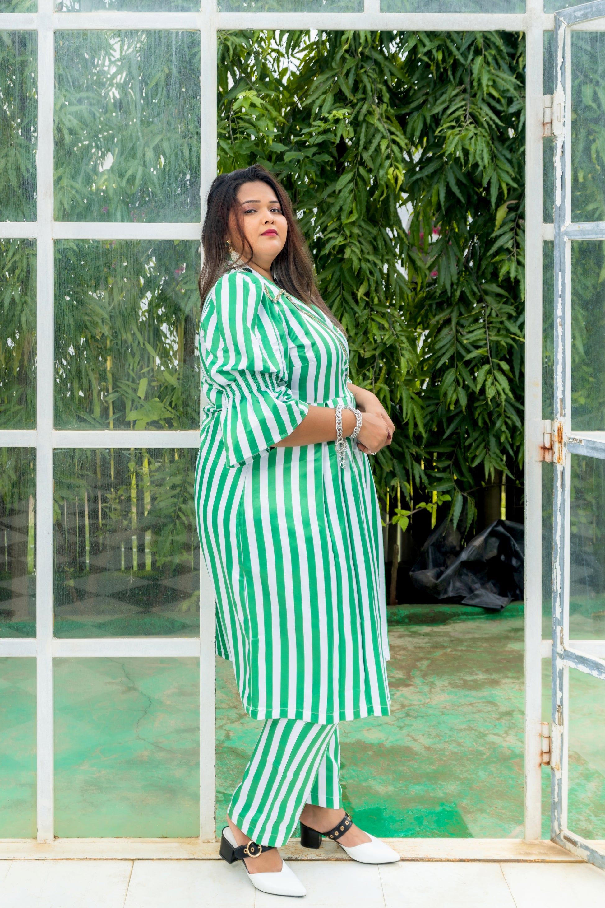 Bottle Green and White pinstripe long kurta with straight pants and stone work detailing