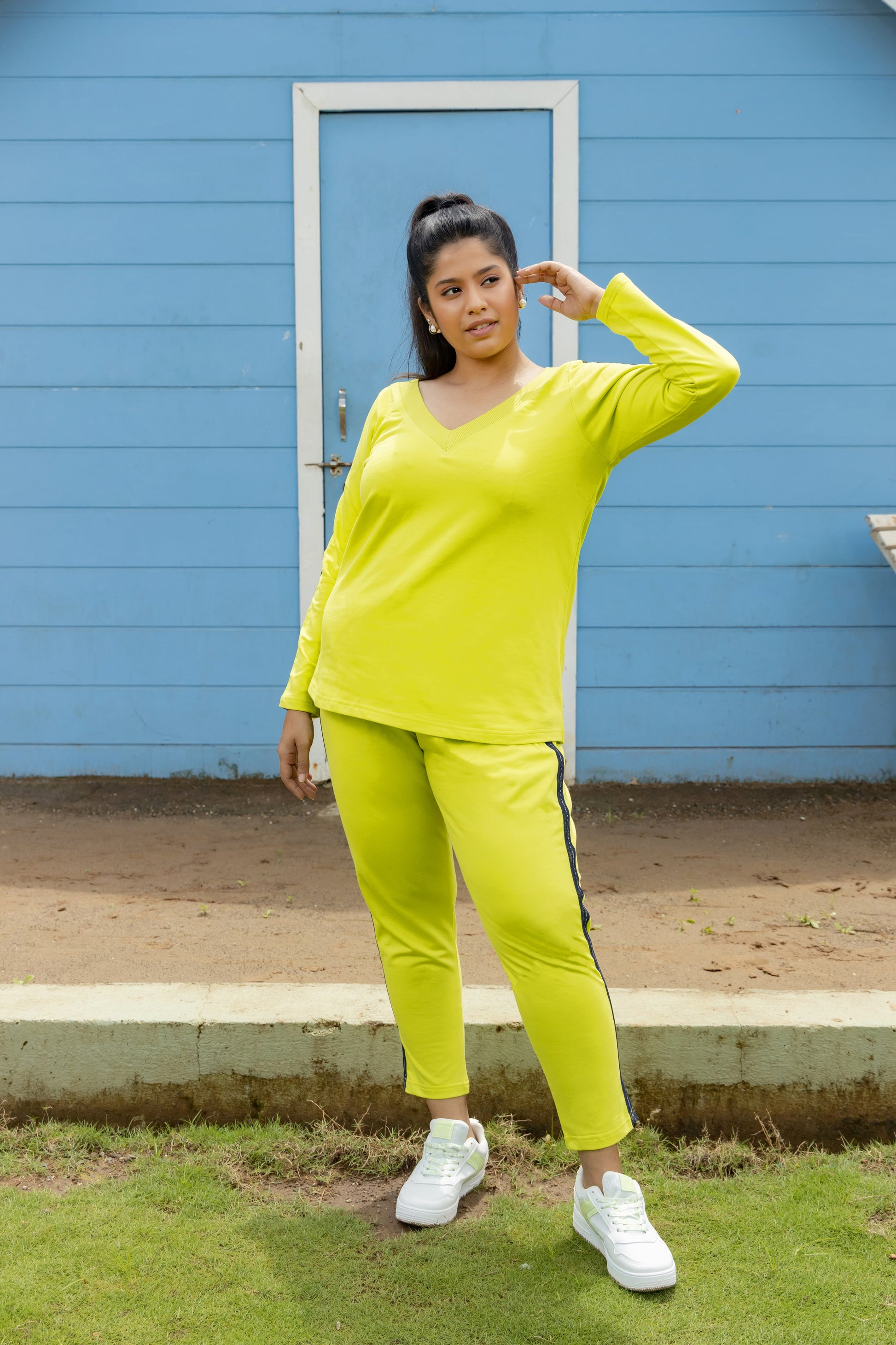 Groove-in-style bright fluorescent leggings and a full sleeve top with detailing on the side