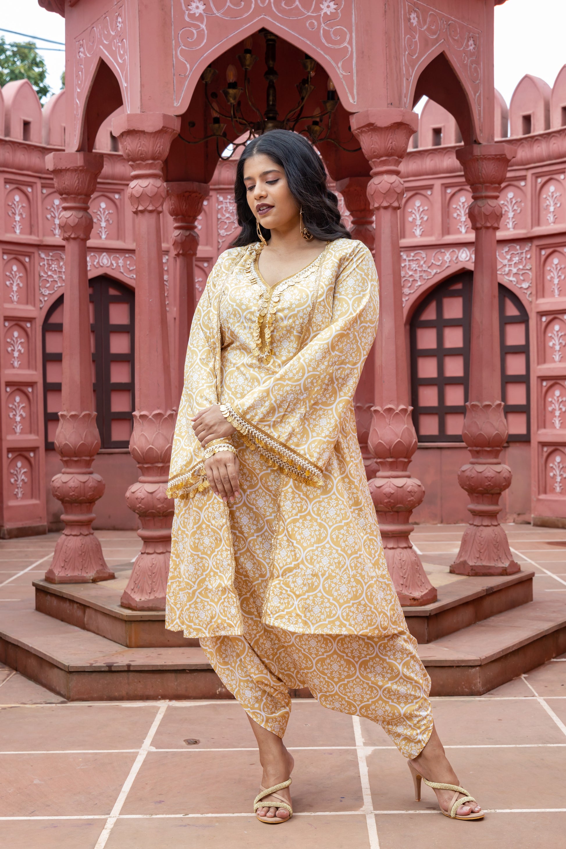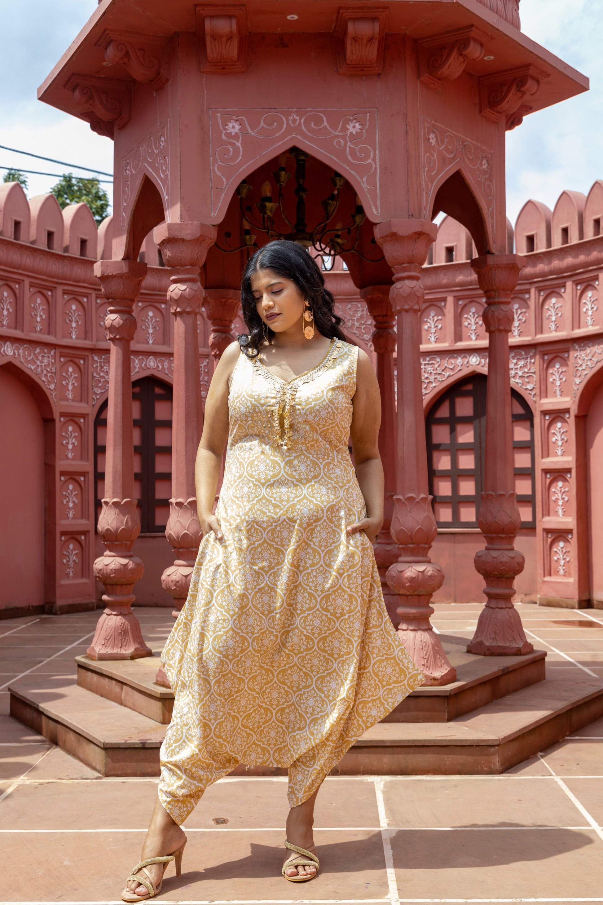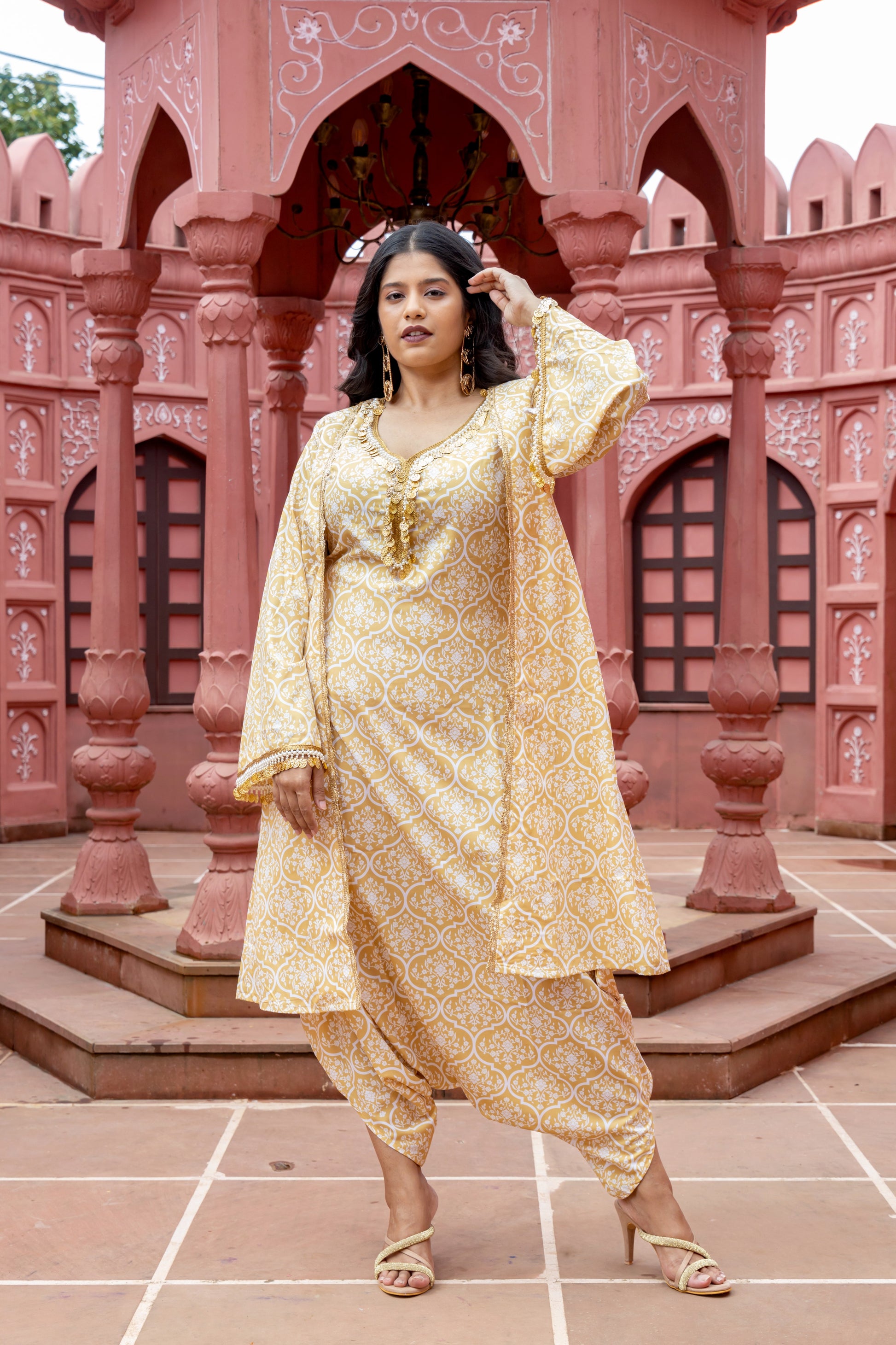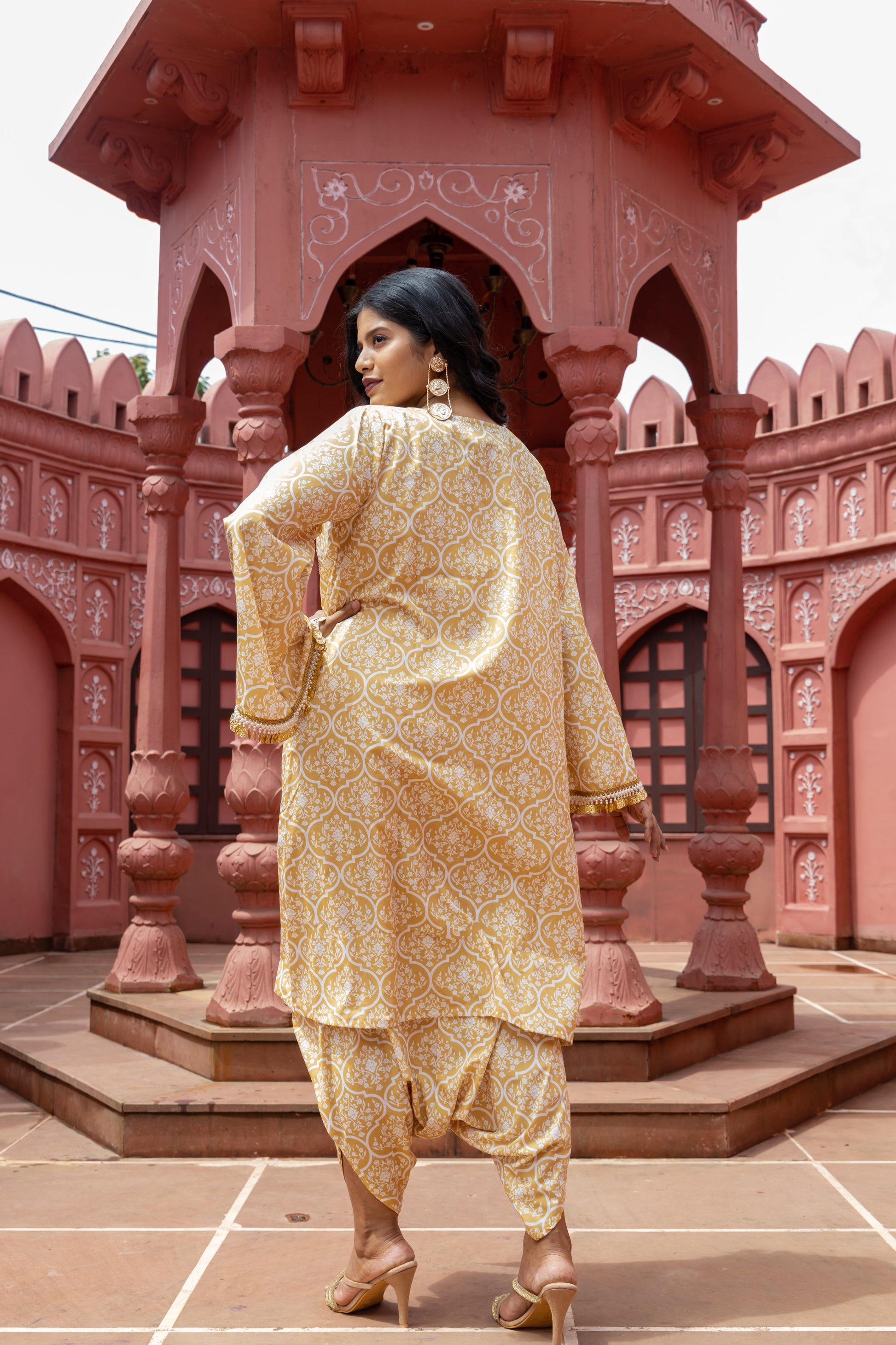 Mustard yellow Dhoti dress with bell-sleeve long jacket and coin work detailing