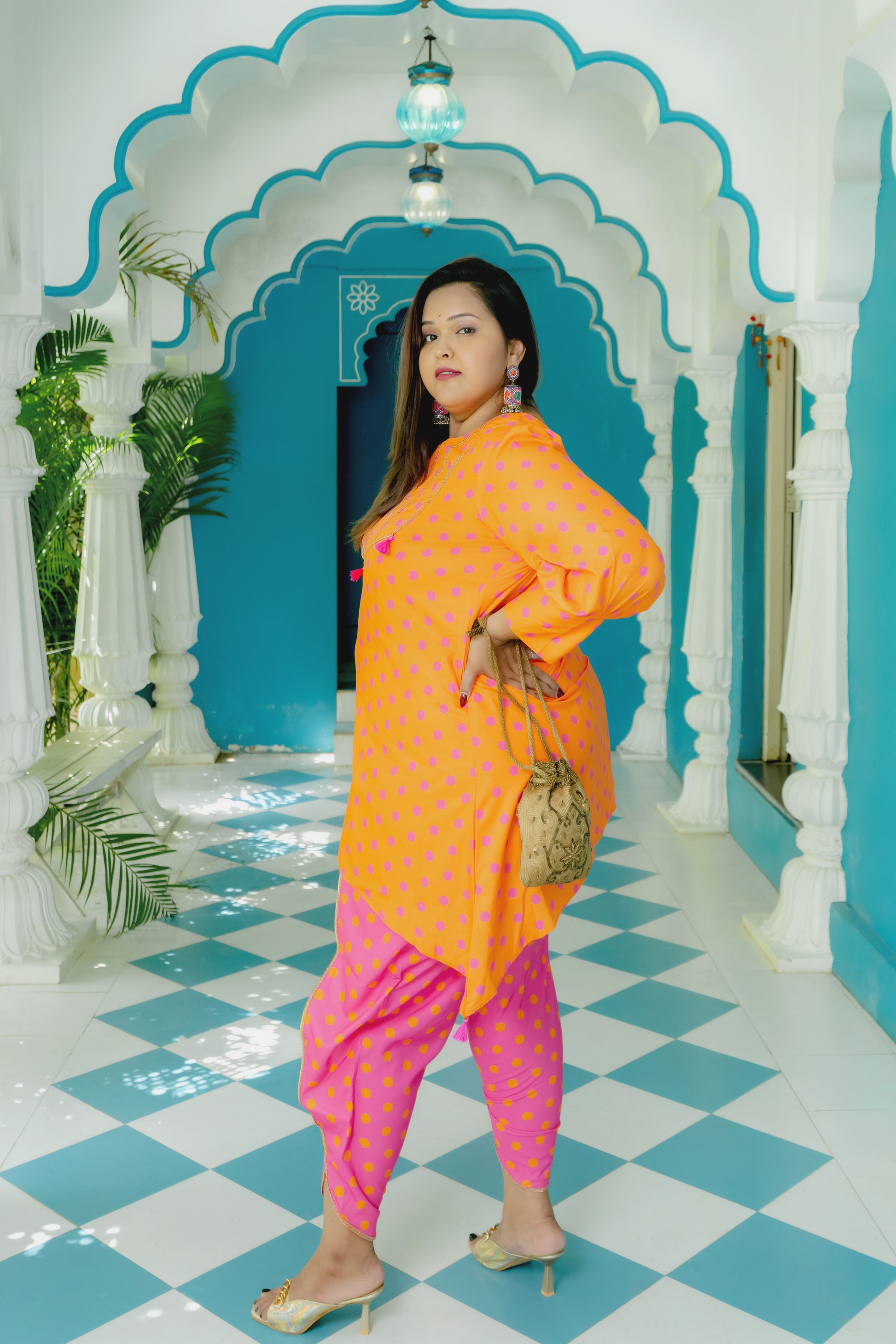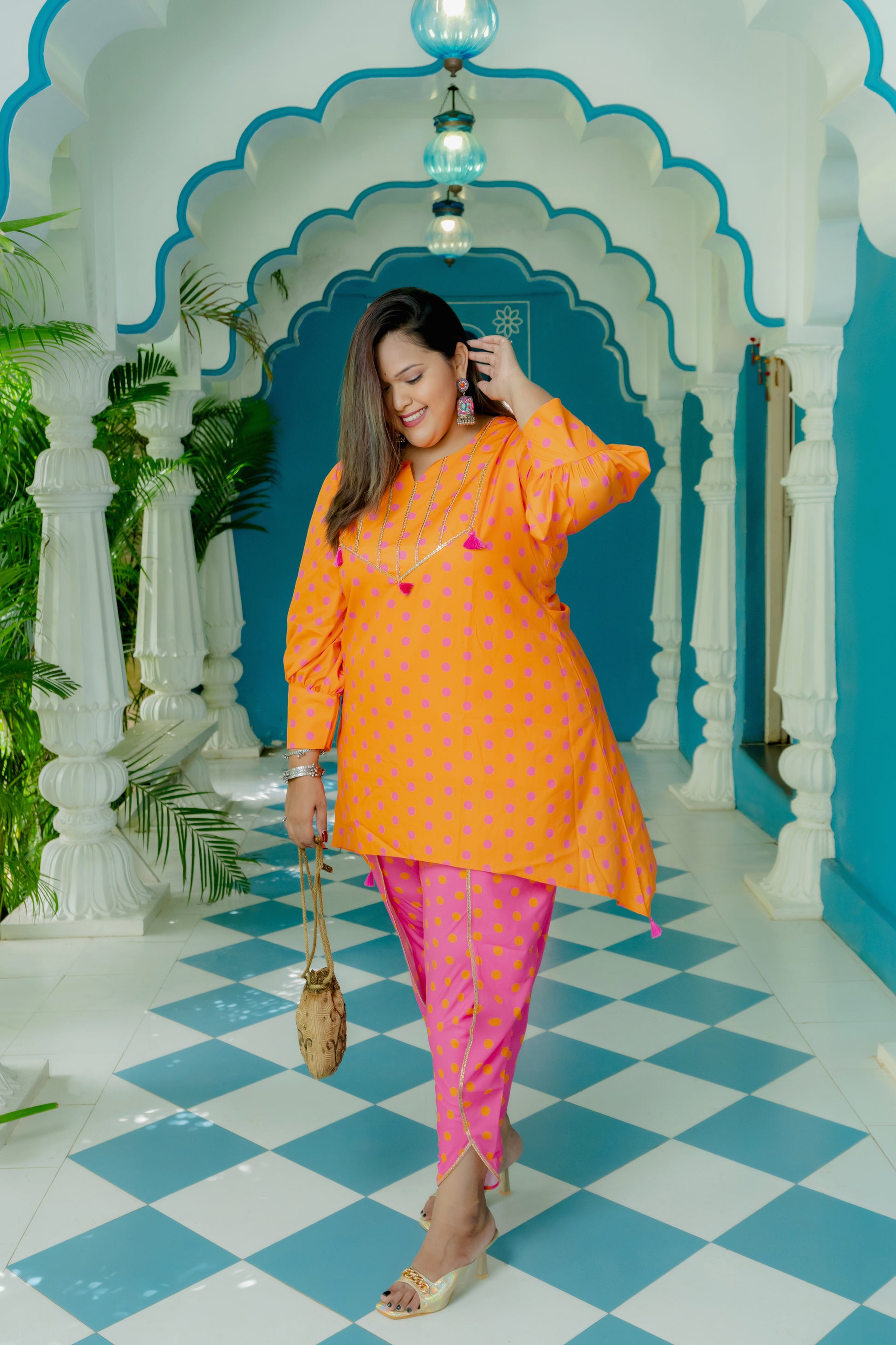 Bright Fuchsia and Orange Polka Dot Kurti with Tulip pants