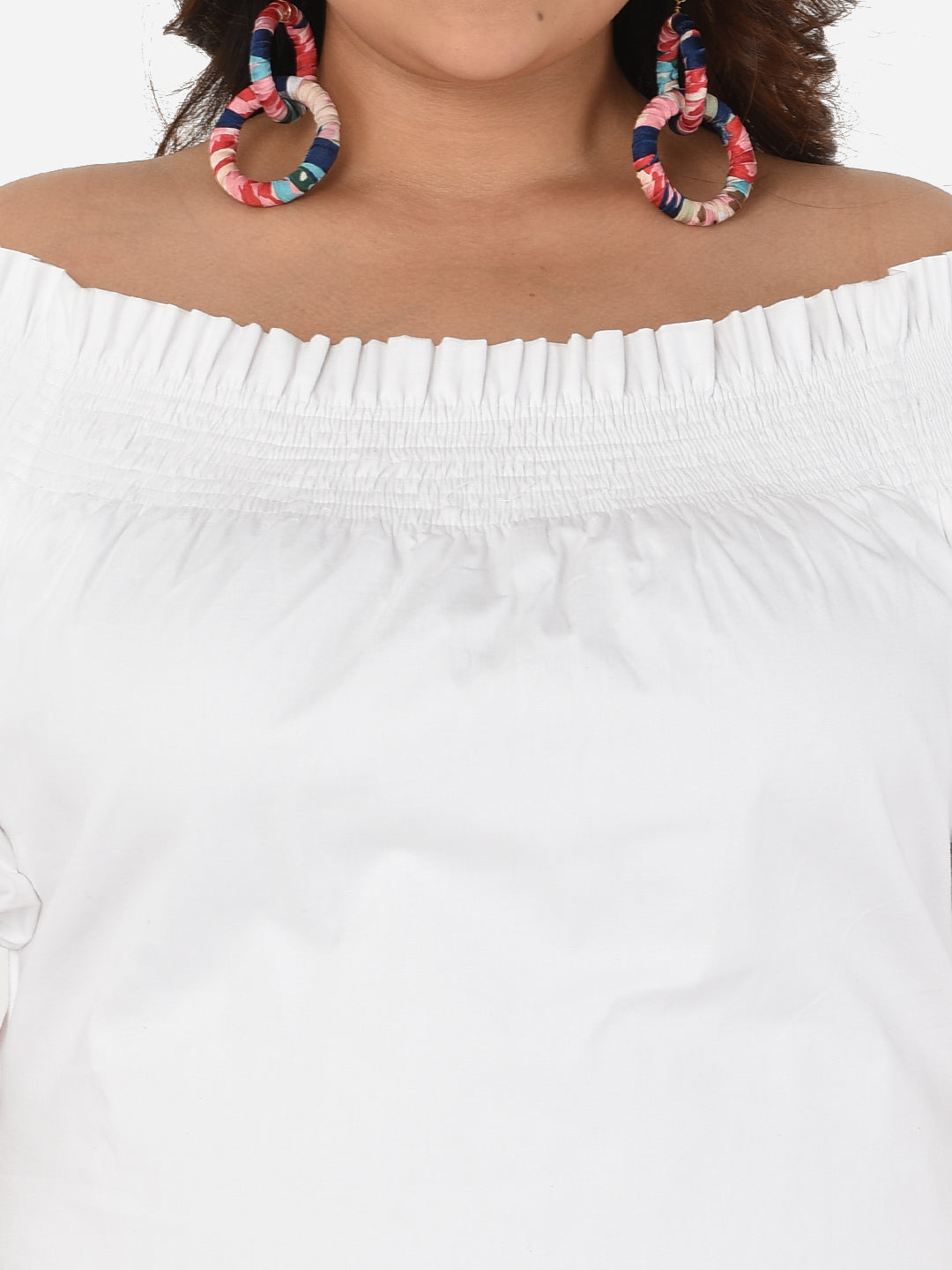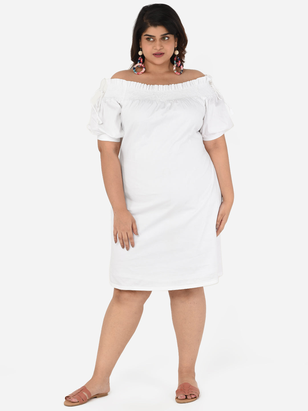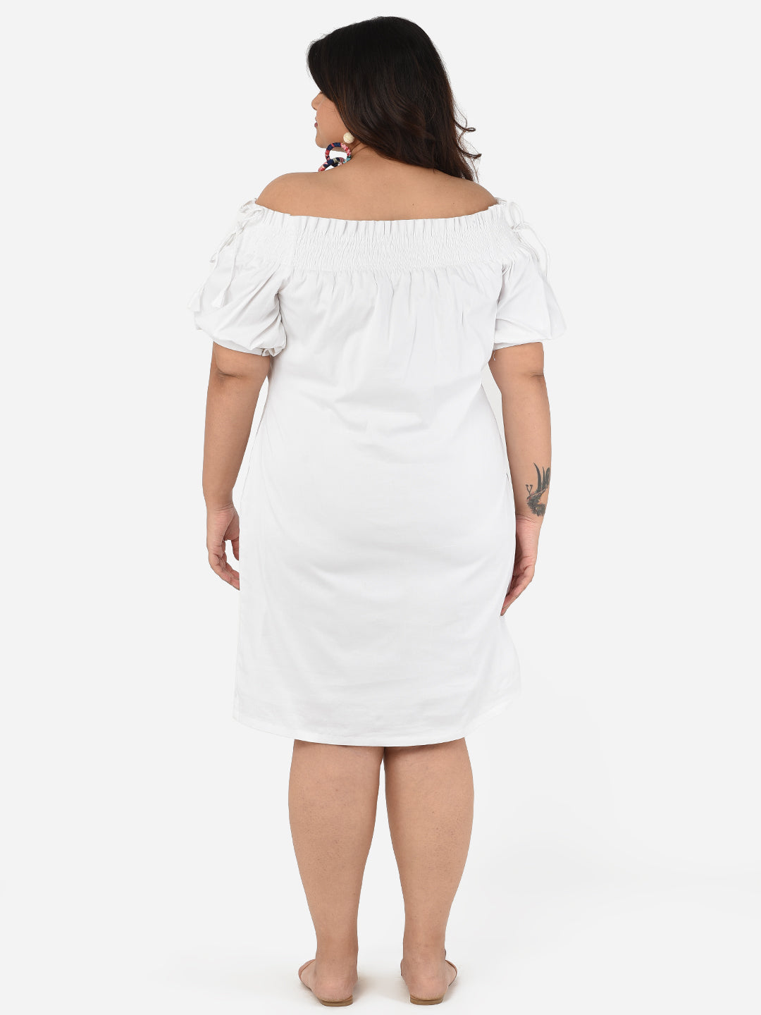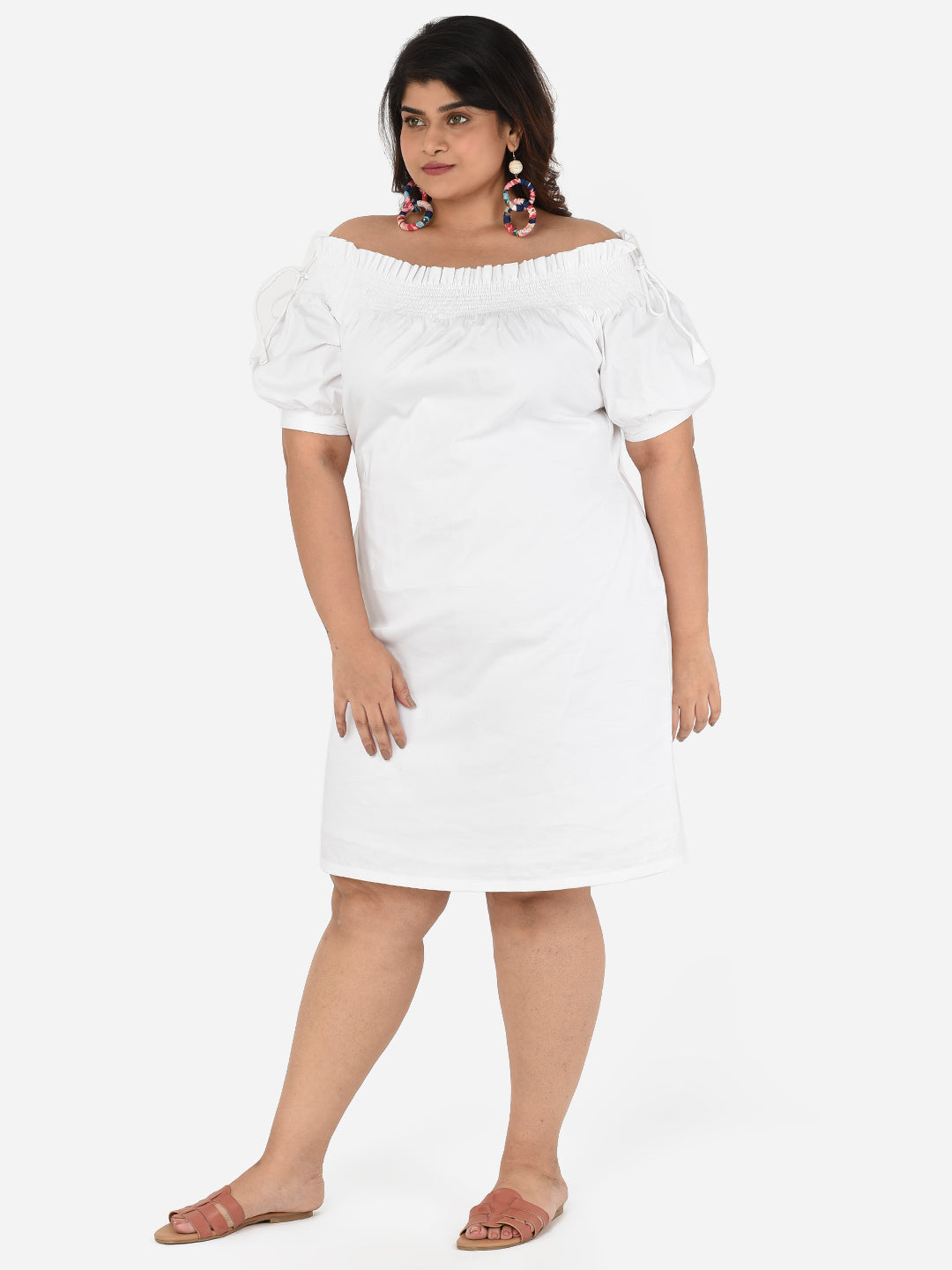 A chic and clean all-white smock plus size dress with puff sleeves and adjustable off-shoulder neckline.
