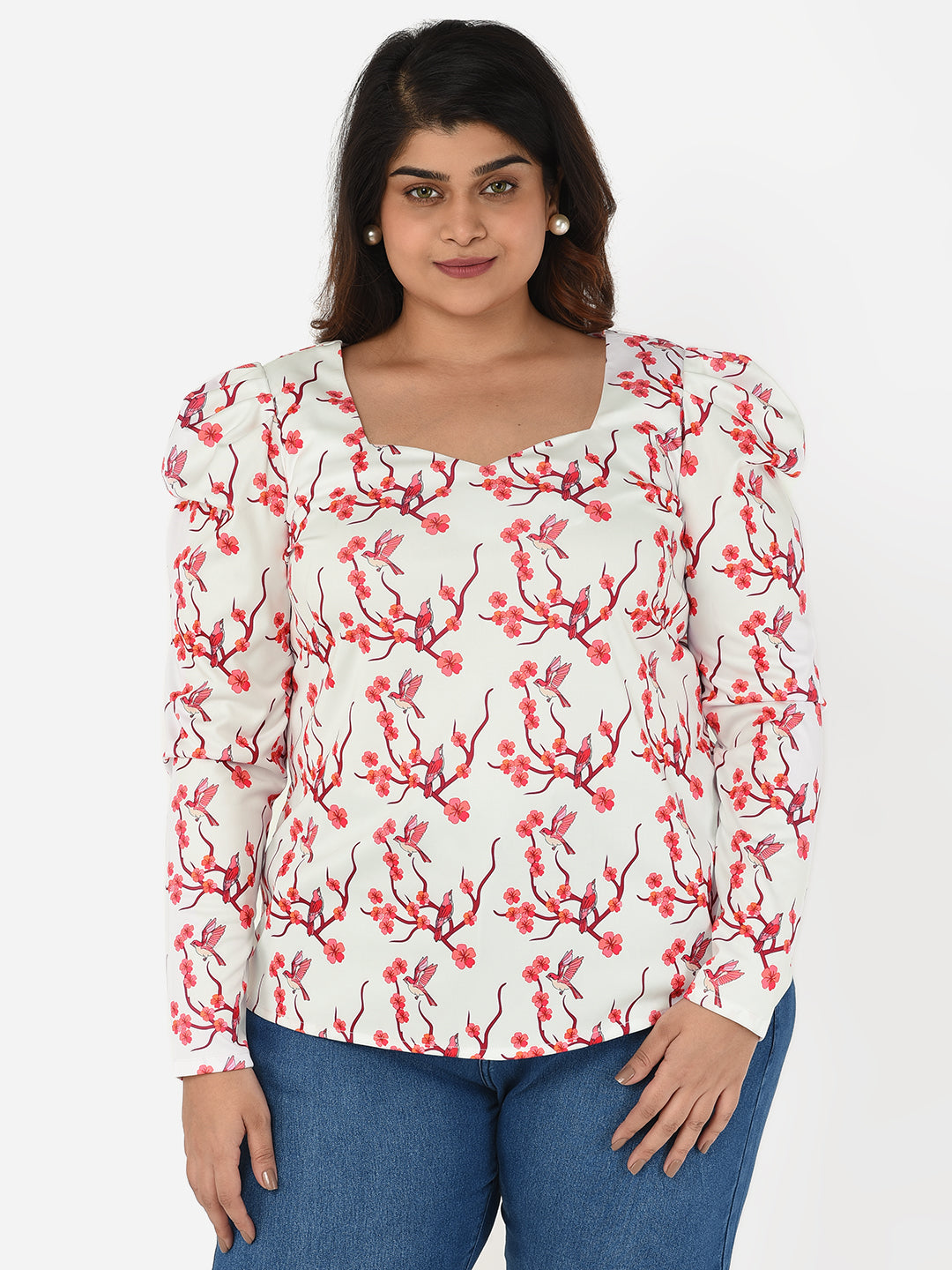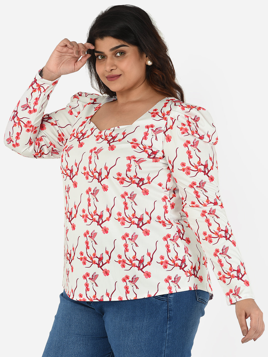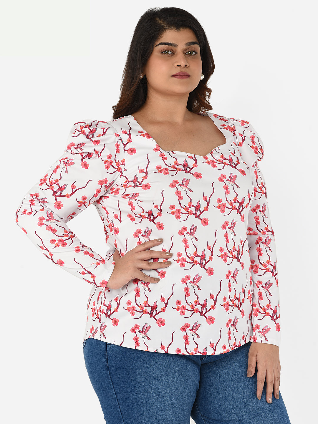 A spring style floral printed plus size top with long bold shoulder sleeves and a queen anne neckline.