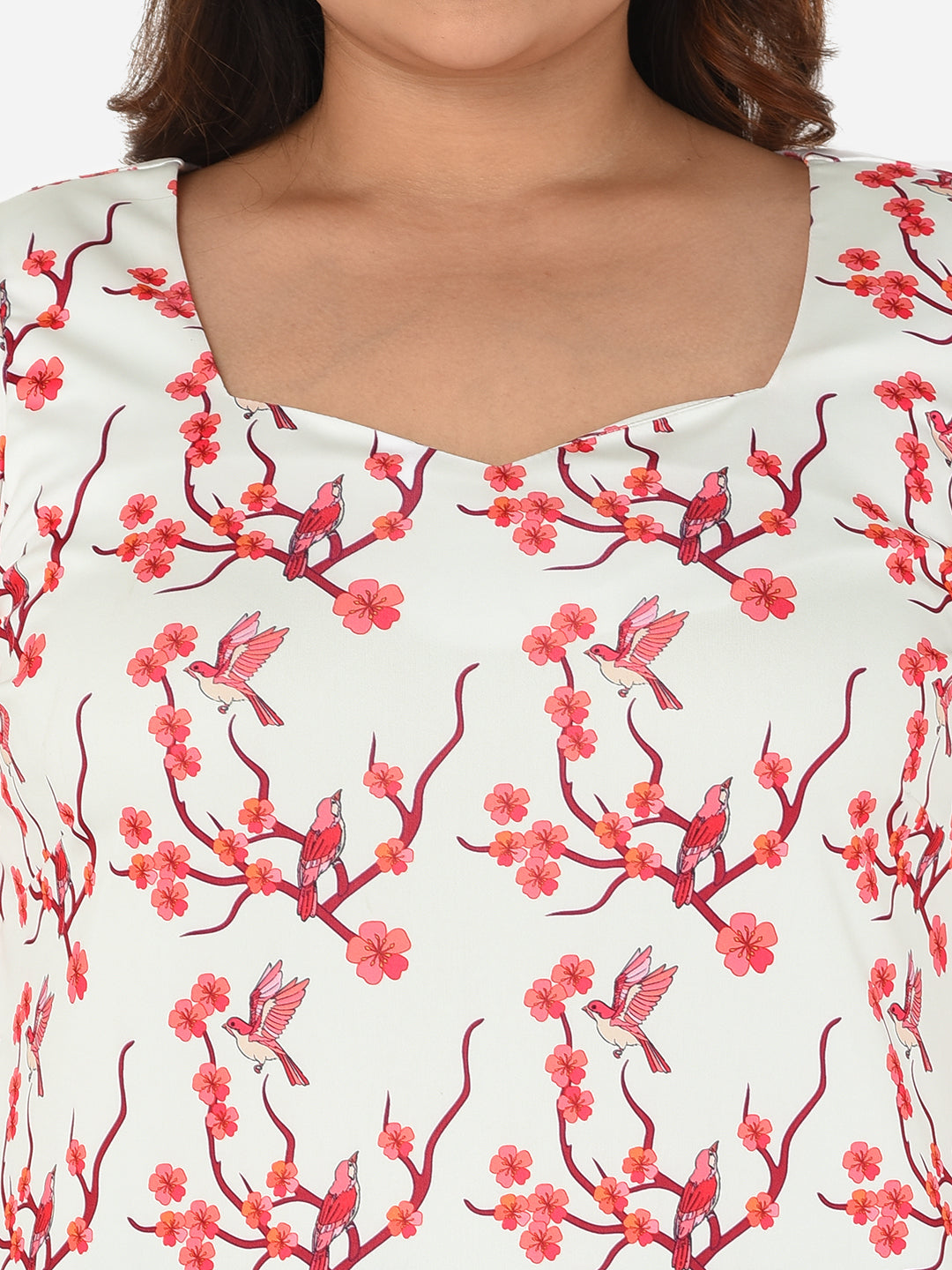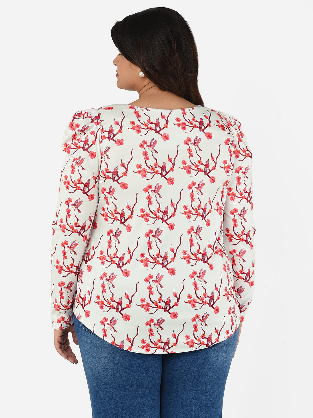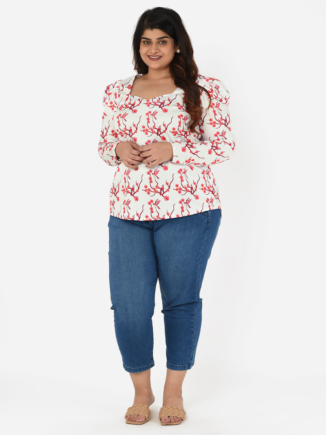 A spring style floral printed plus size top with long bold shoulder sleeves and a queen anne neckline.