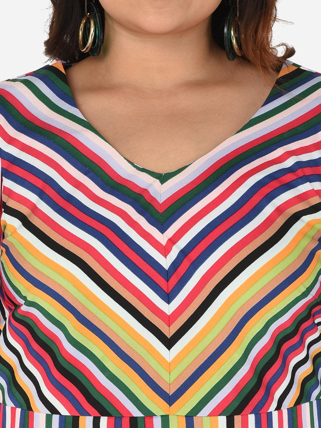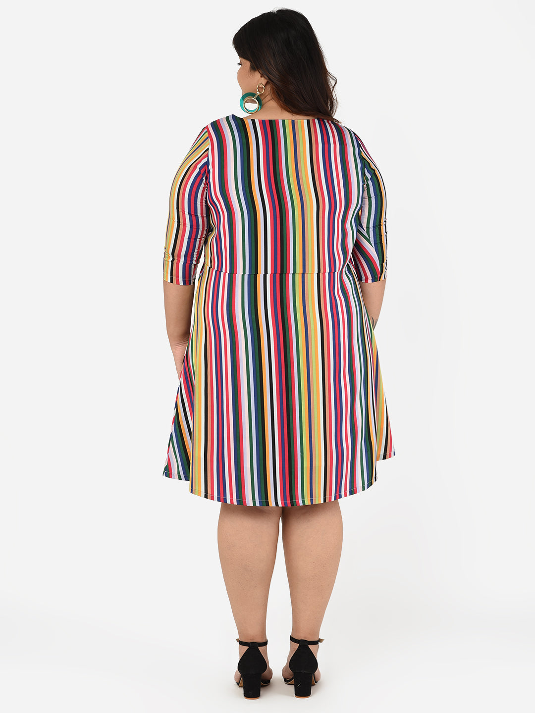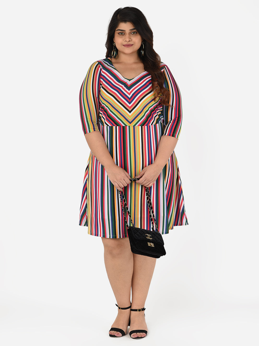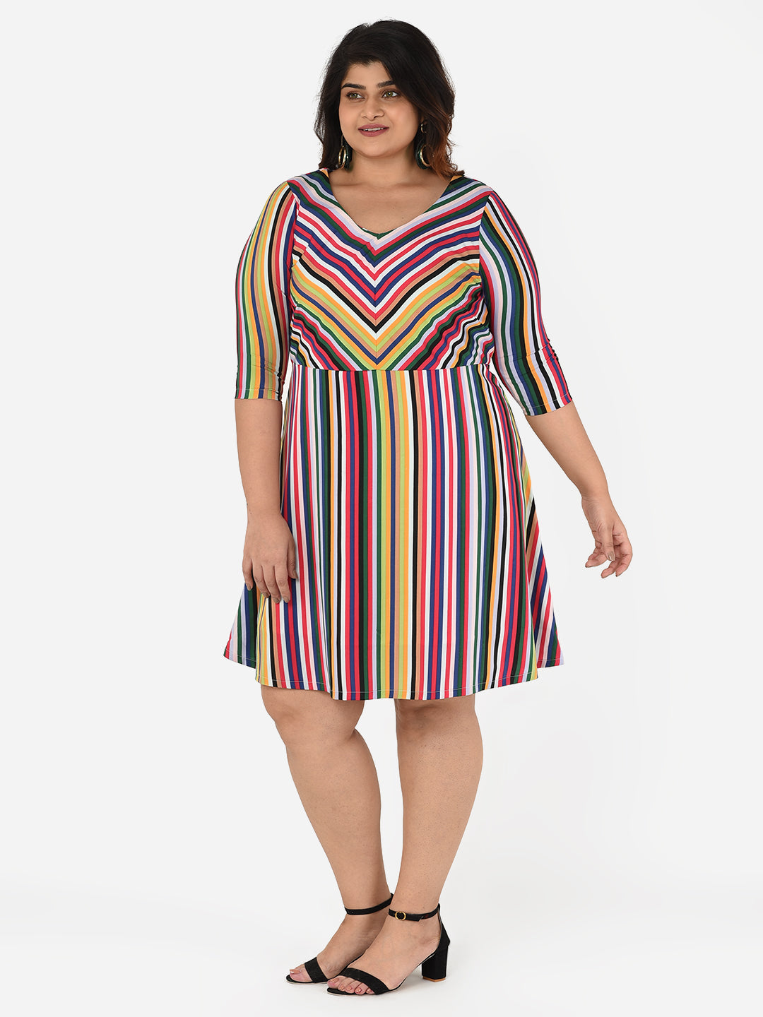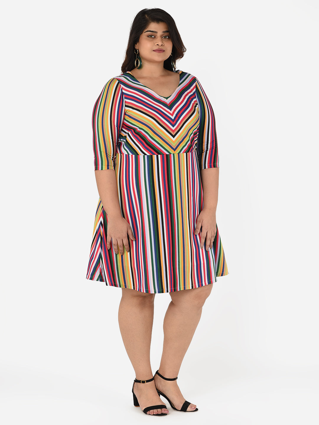 A preppy skater plus size dress with colorful pinstripes with a V-neck.