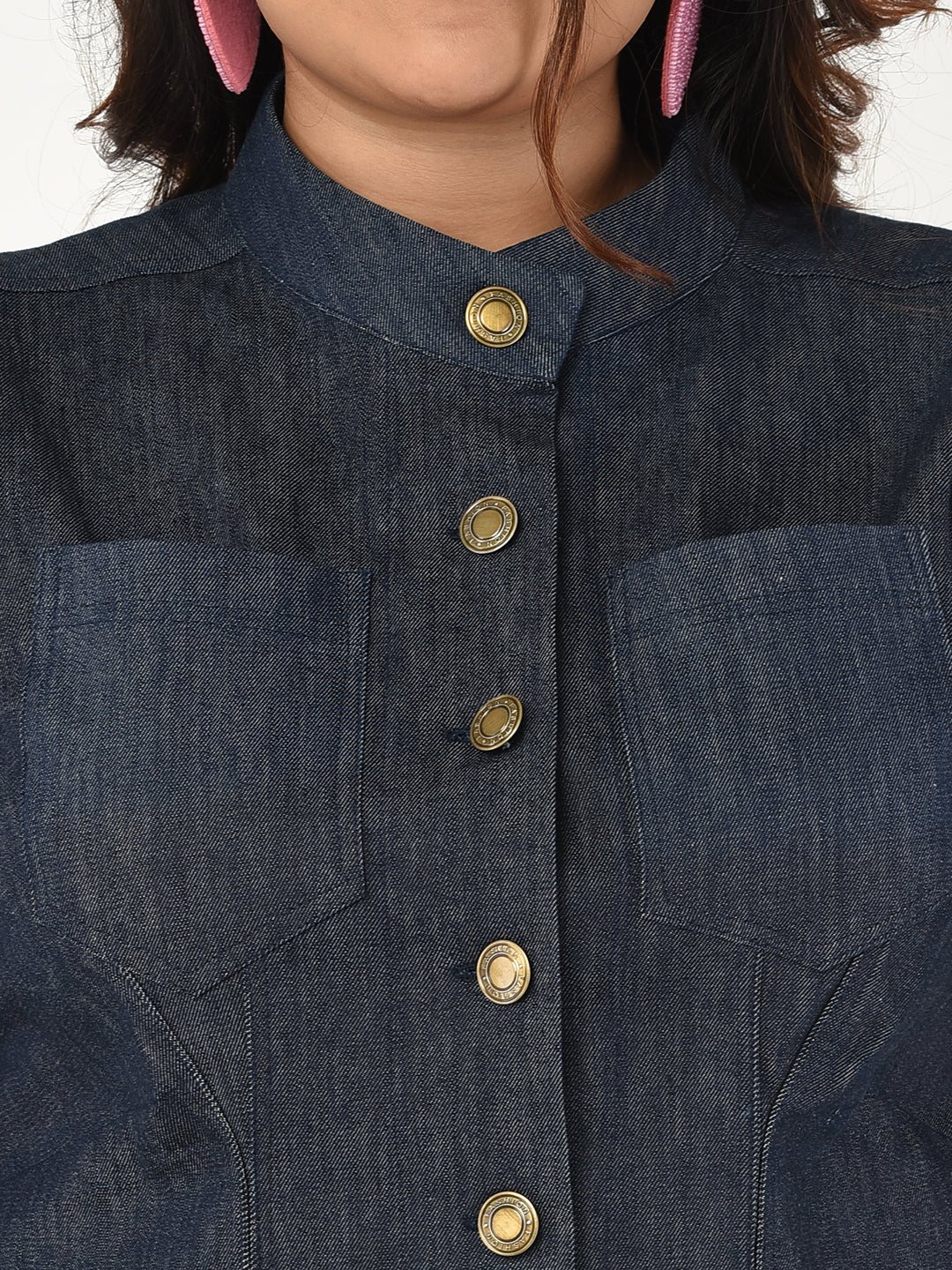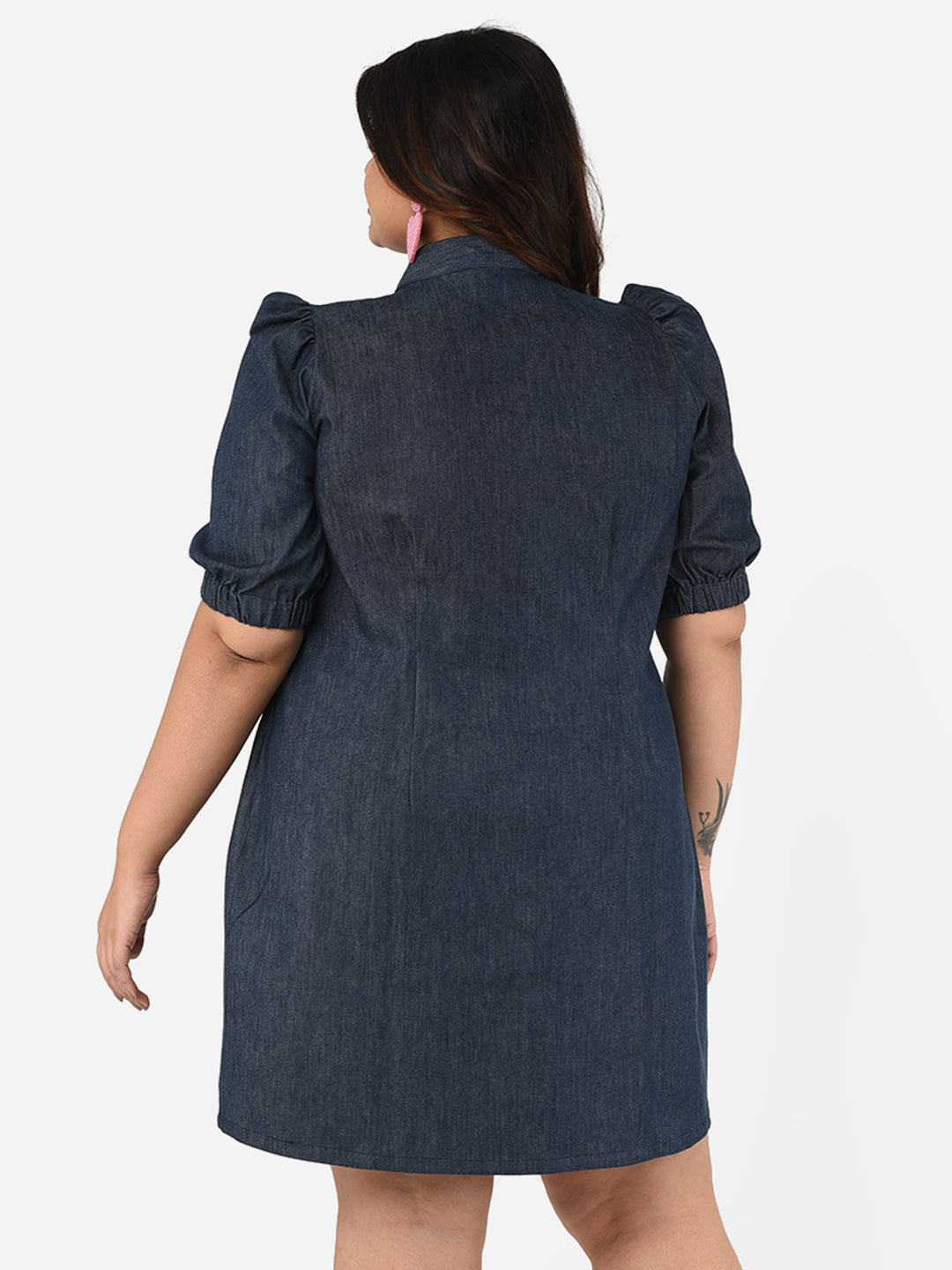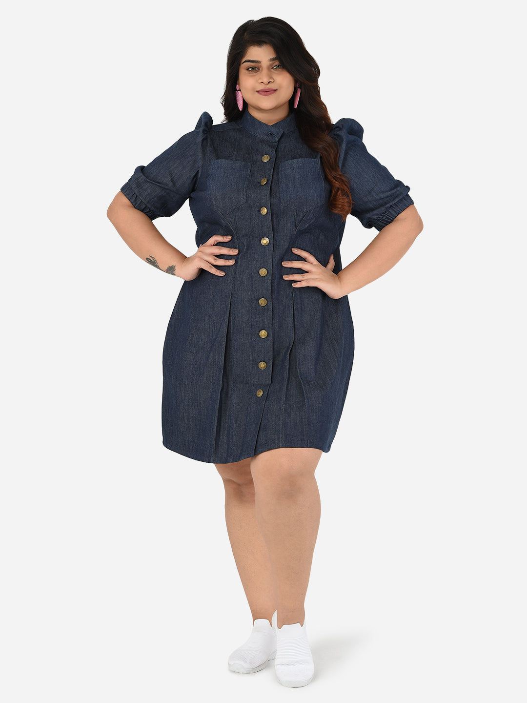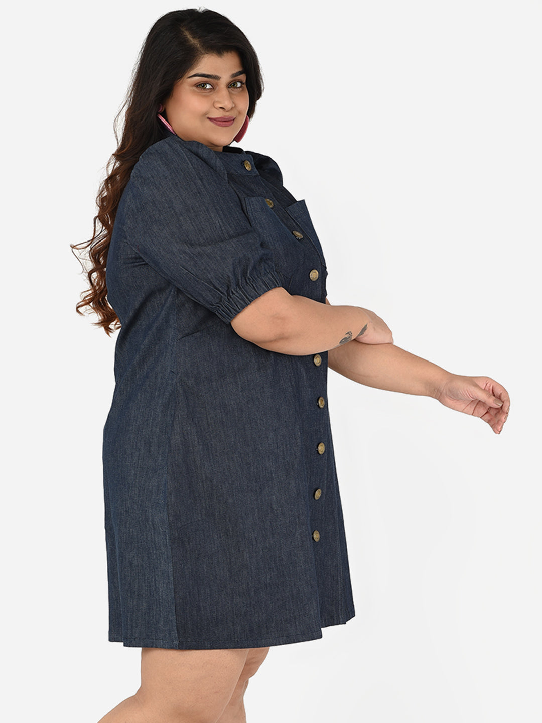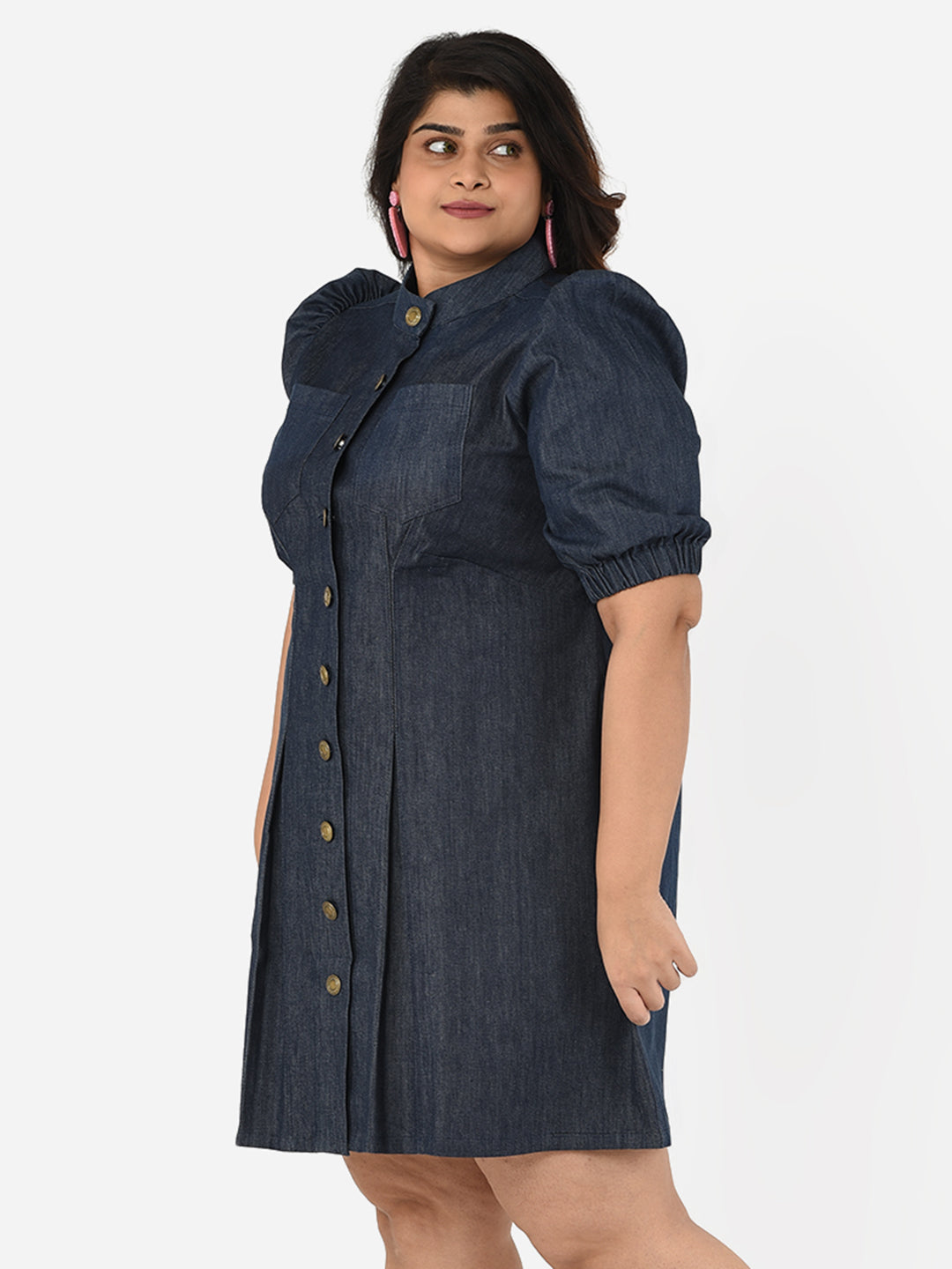 A solid contemporary denim plus size dress with metallic button detailing, mandarin collar and bishop sleeves.