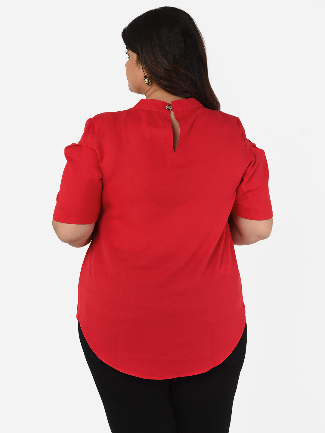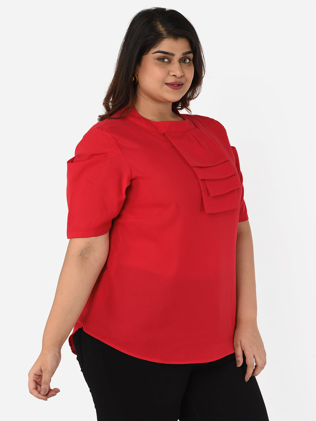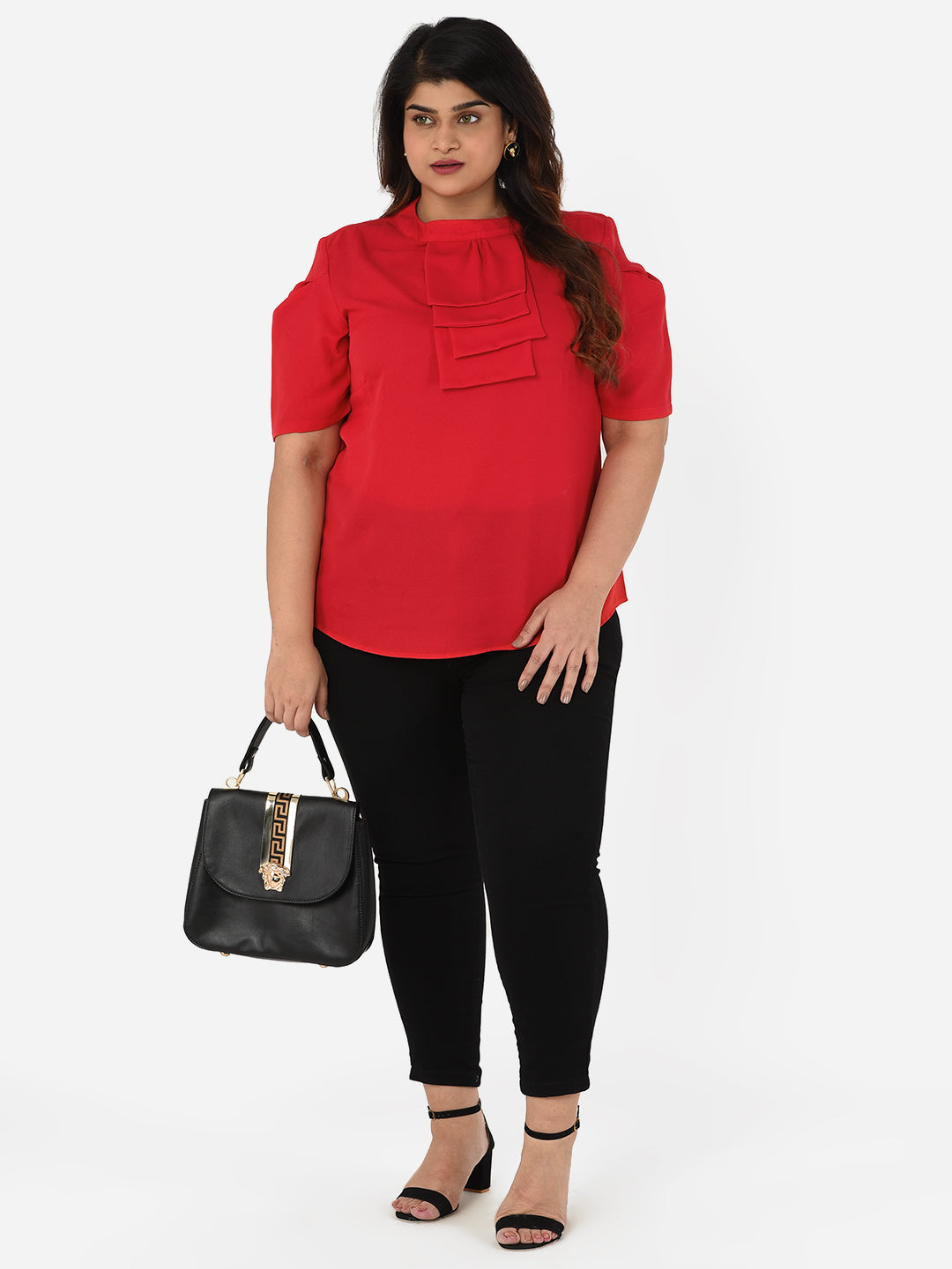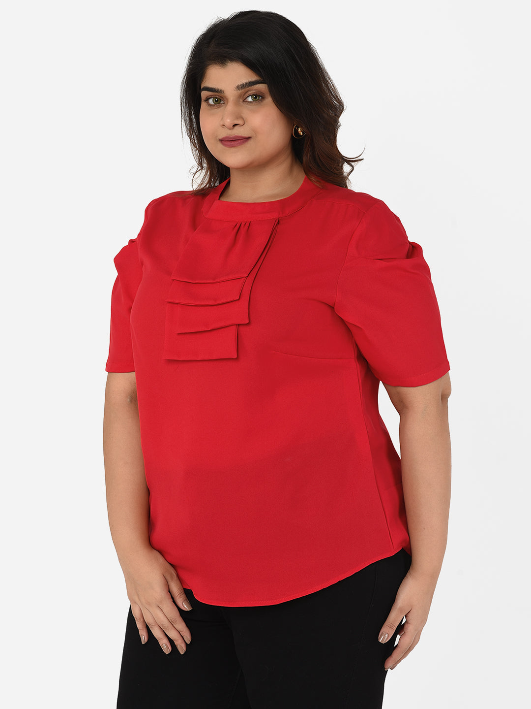 A contemporary red plus size top with a cascade collar and puff sleeves.