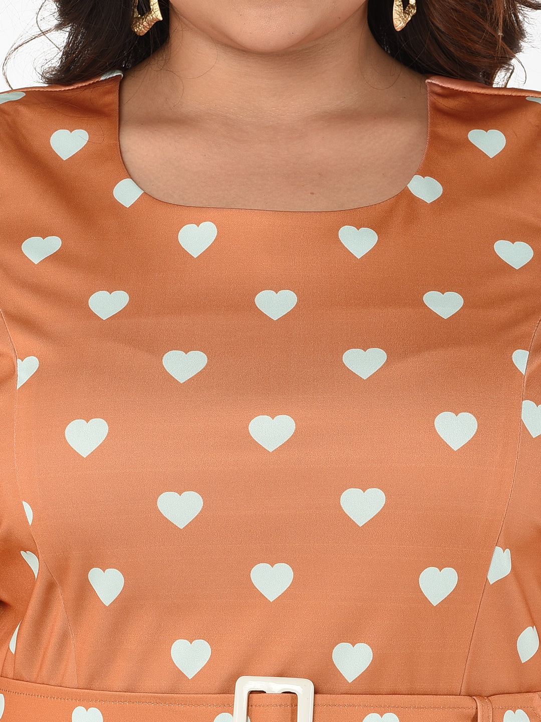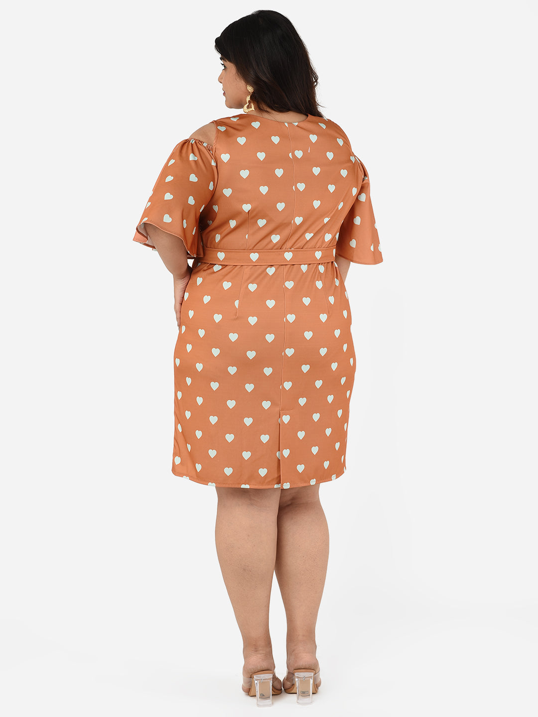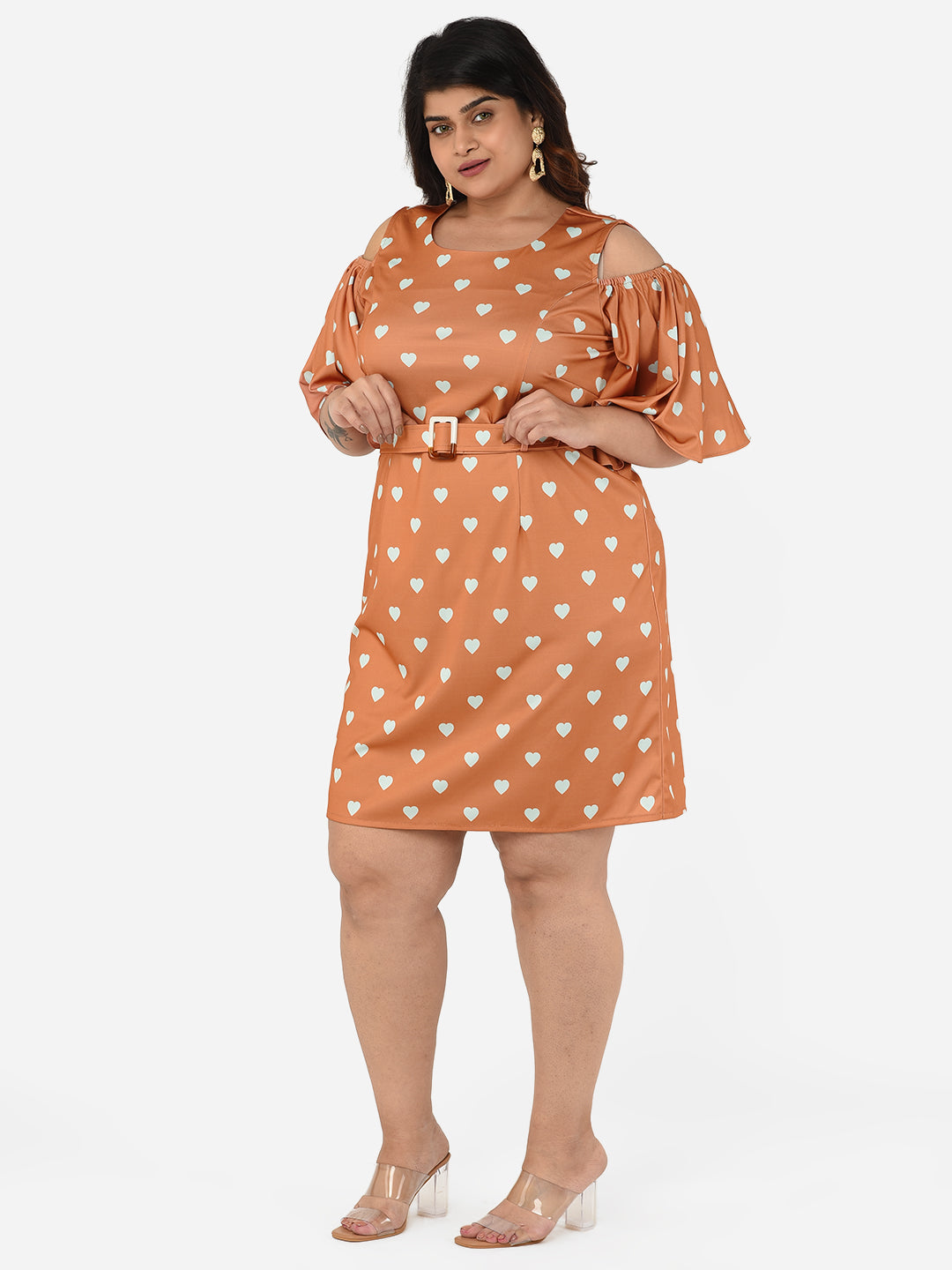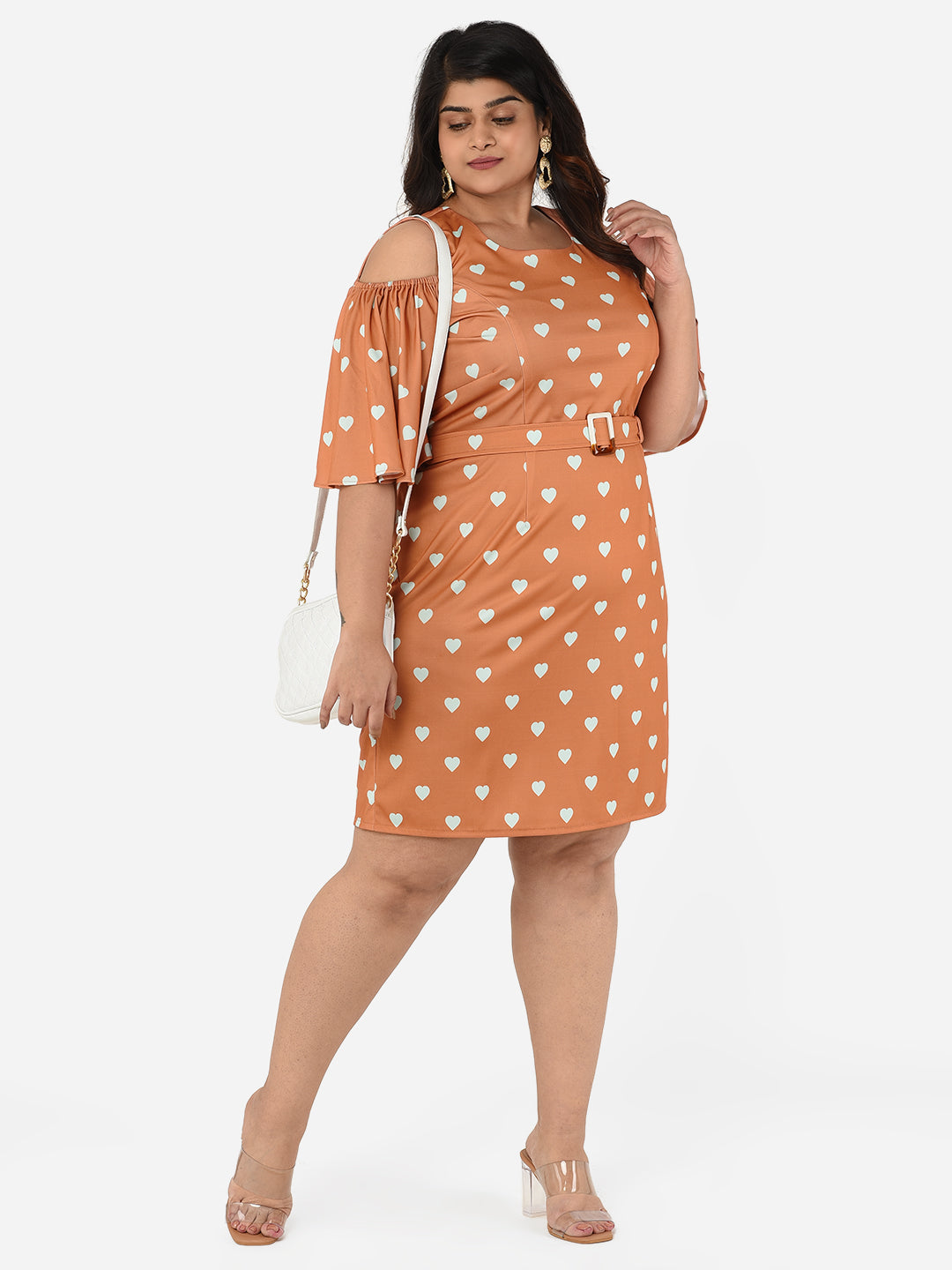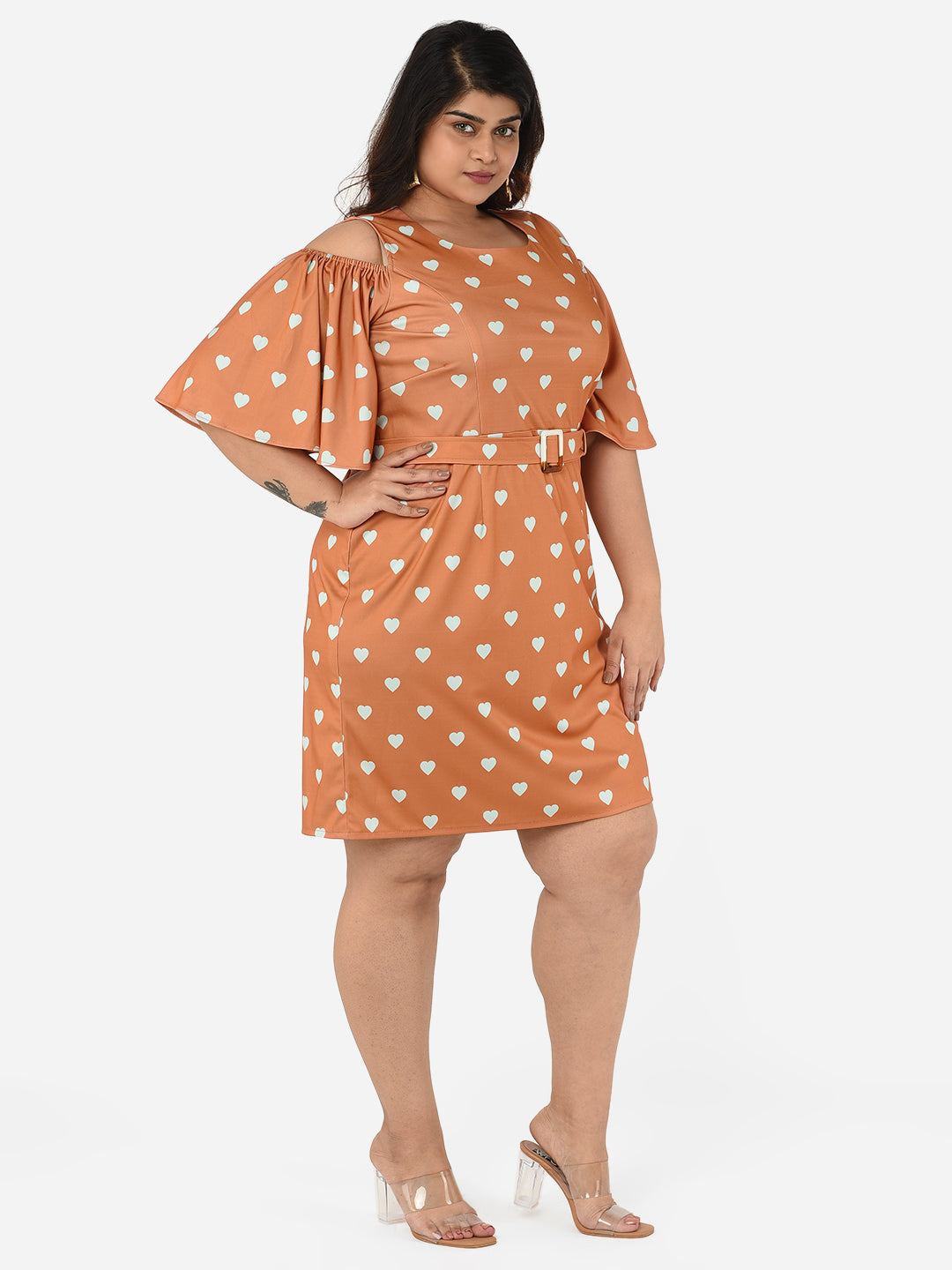 A straight fit plus size dress with dainty heart prints, cold shoulders completed with a belt.