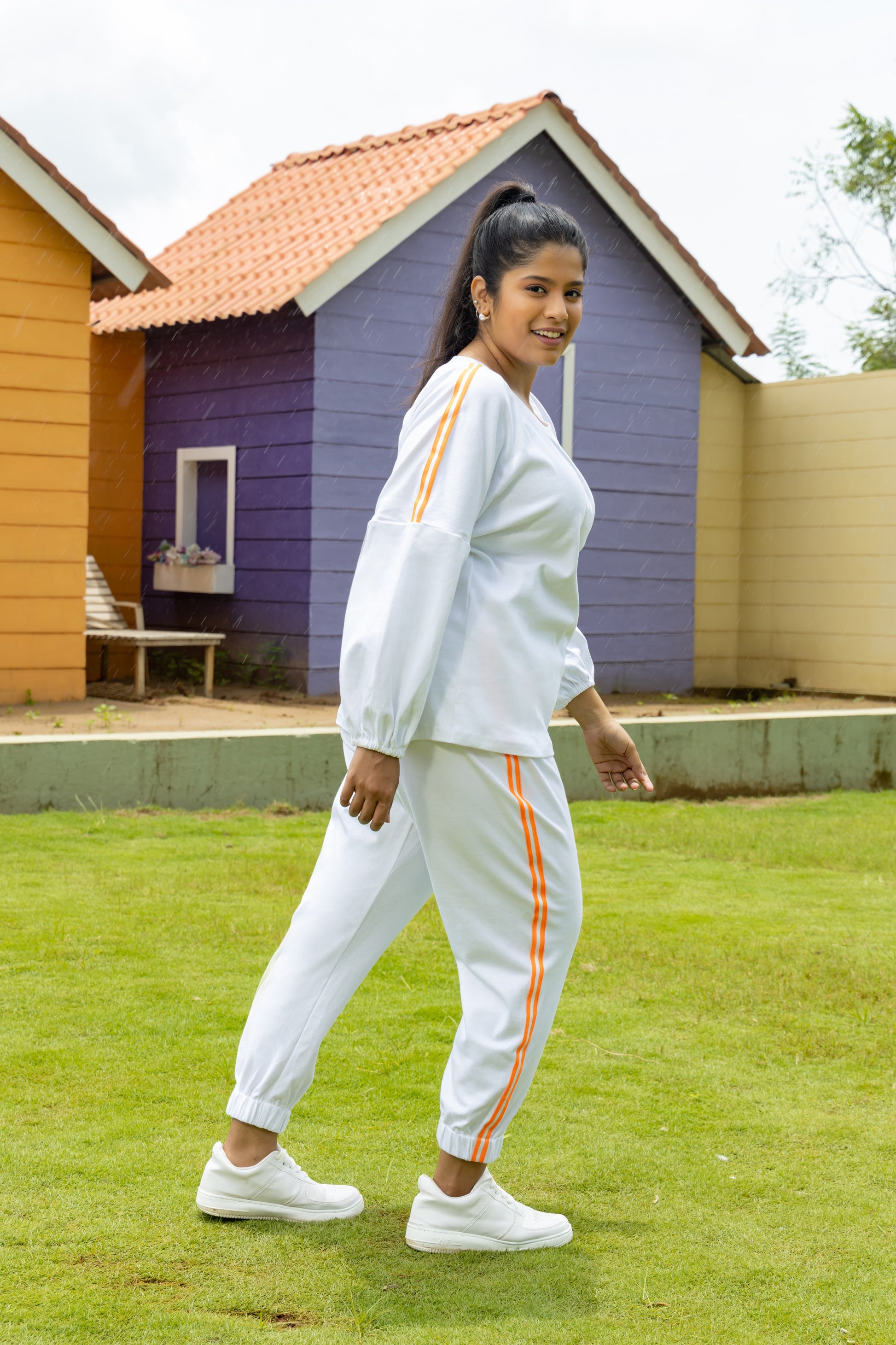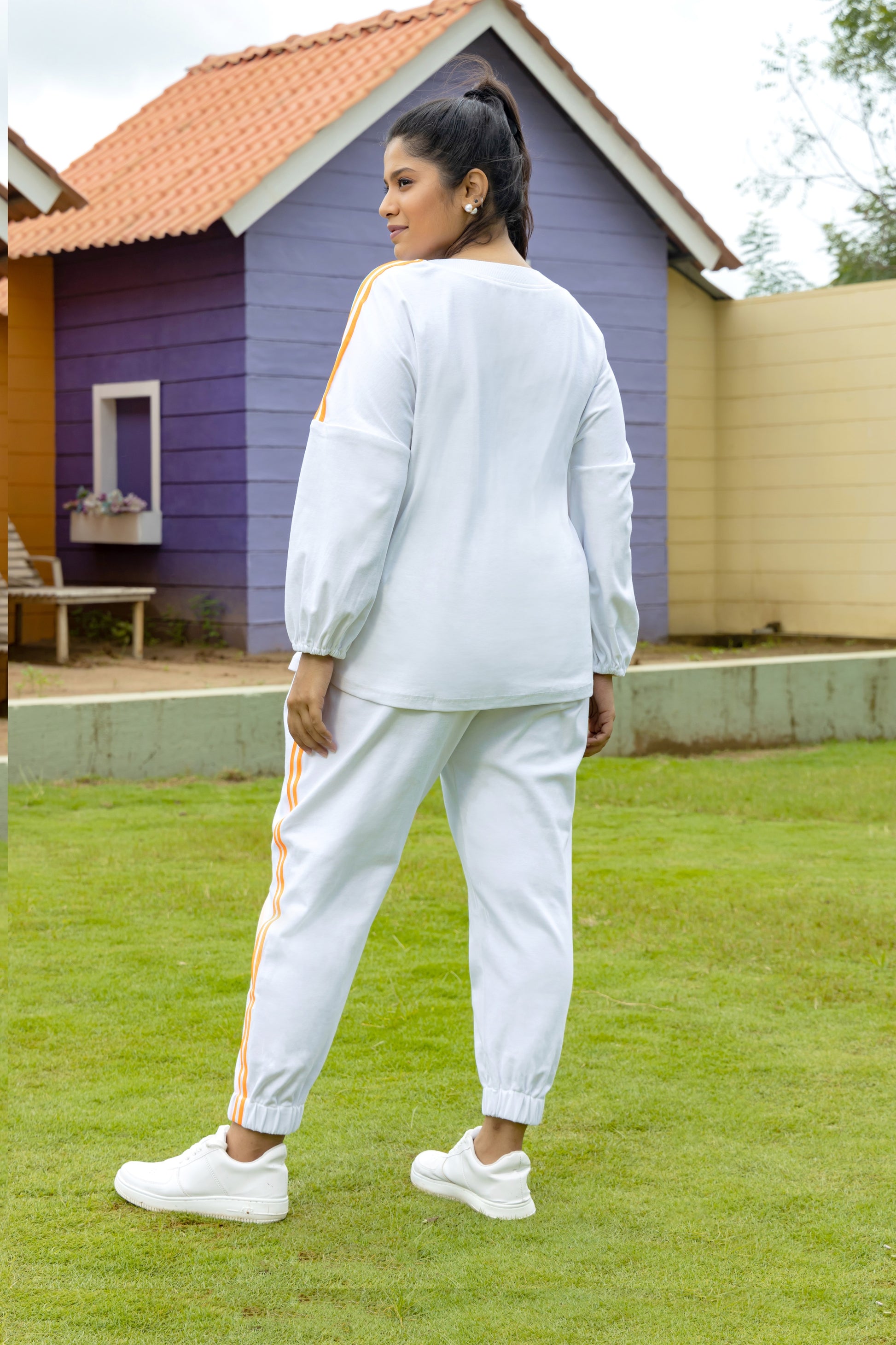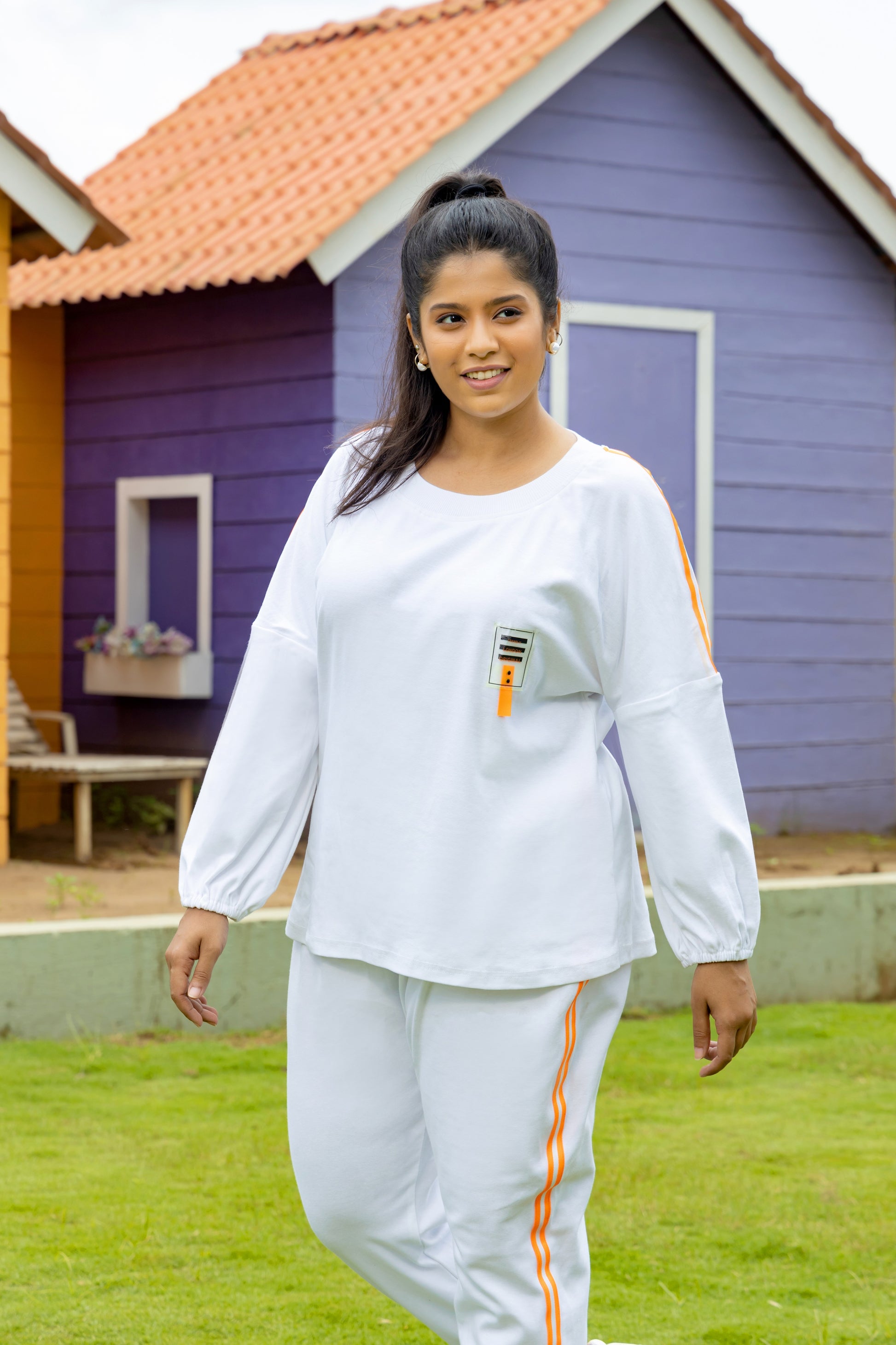 Pristine white Jogger Pants with Bishop-sleeve Top and bright orange detailing