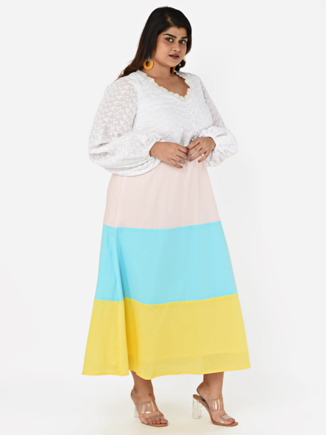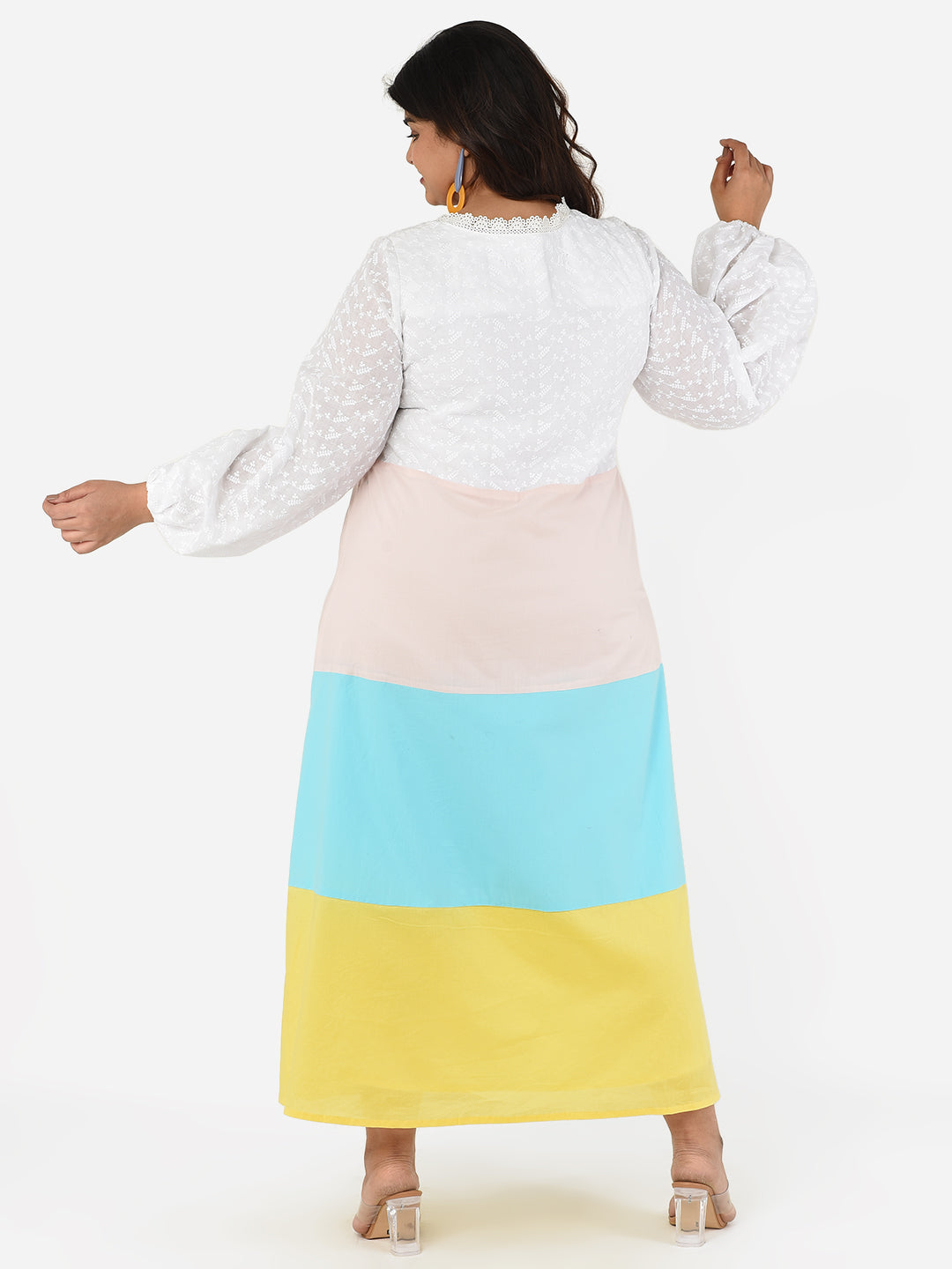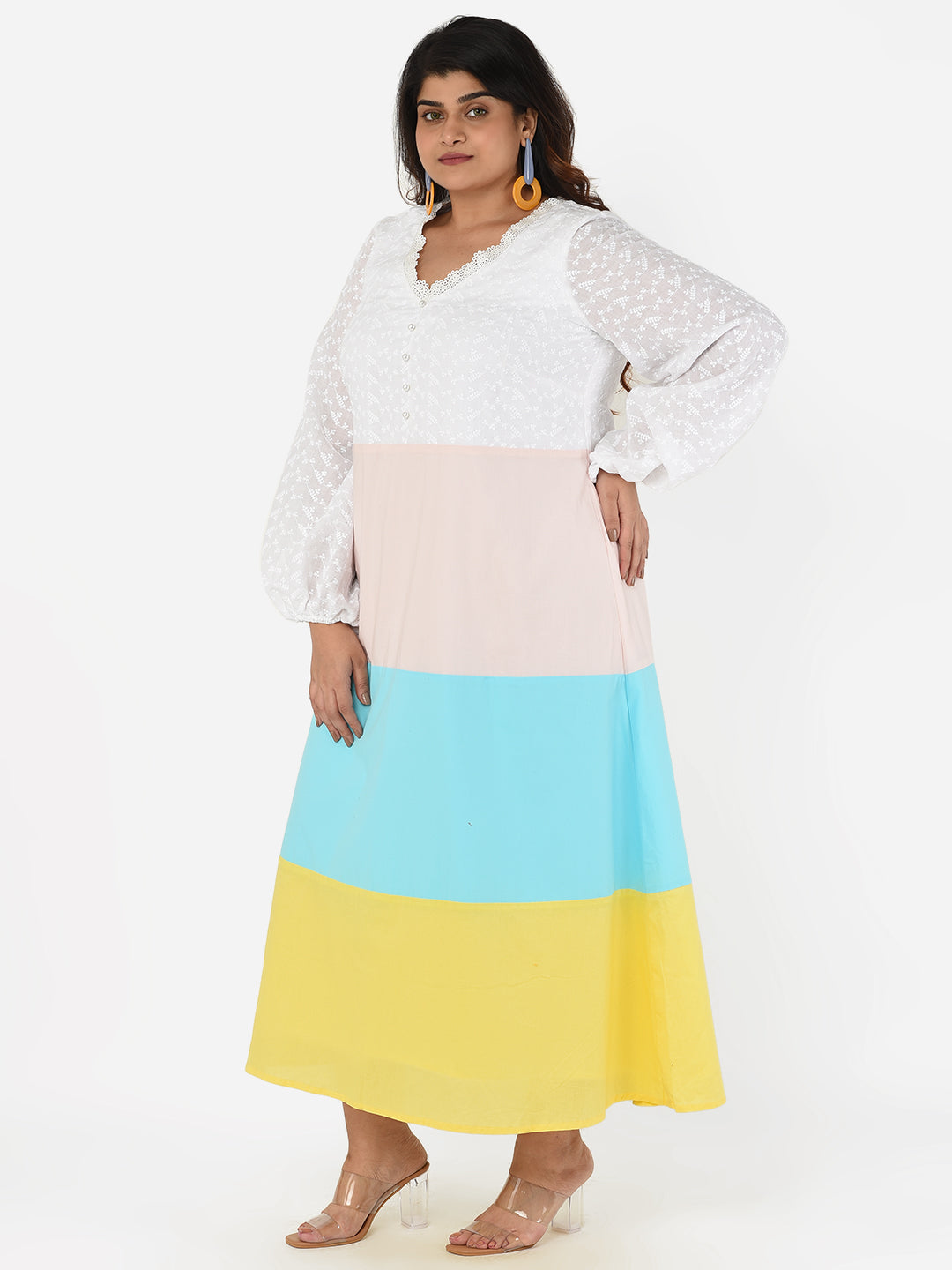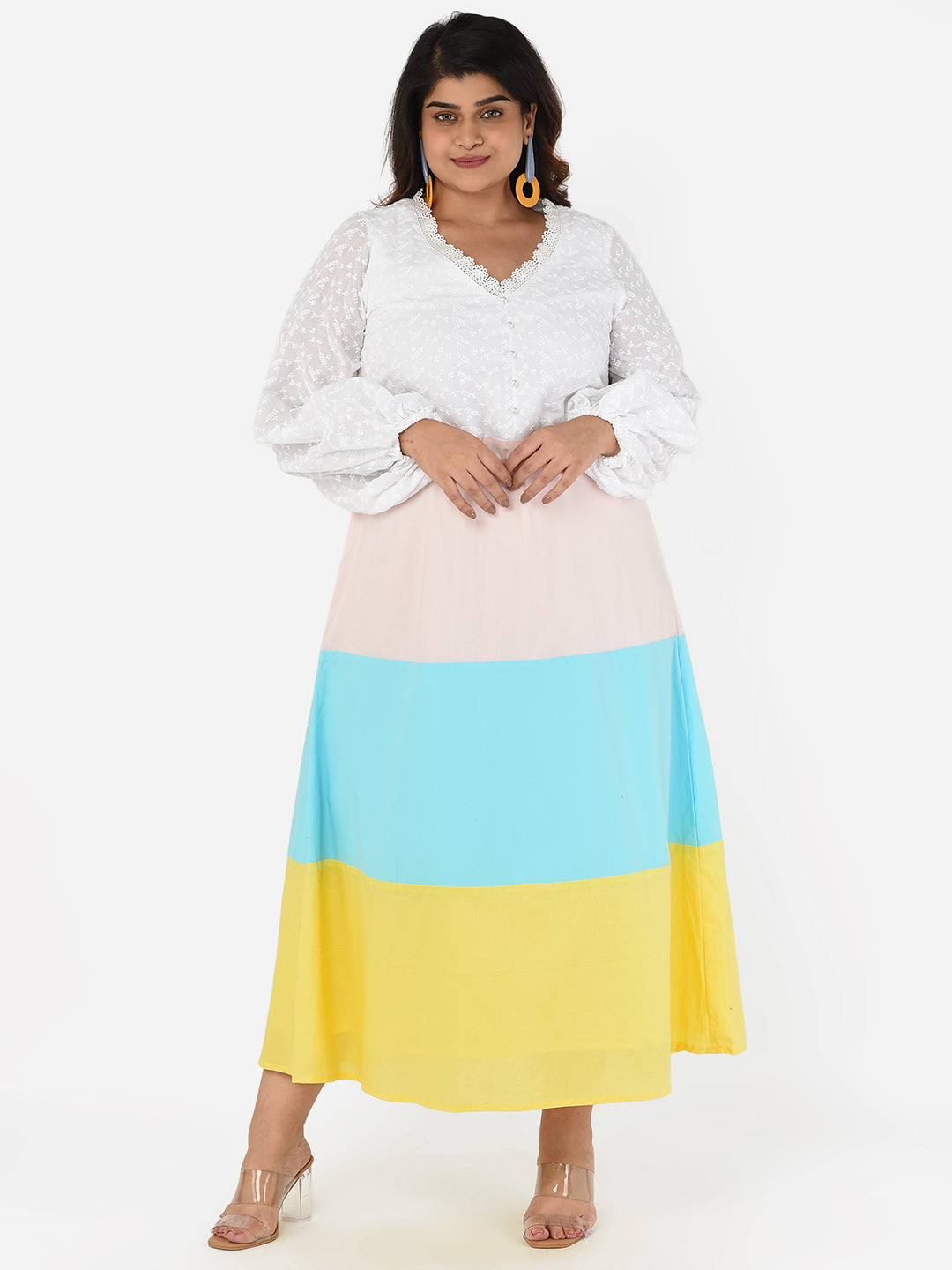 A boho-chic color blocked tiered plus size maxi dress with a chikankari top, lacy neckline and bishop sleeves.