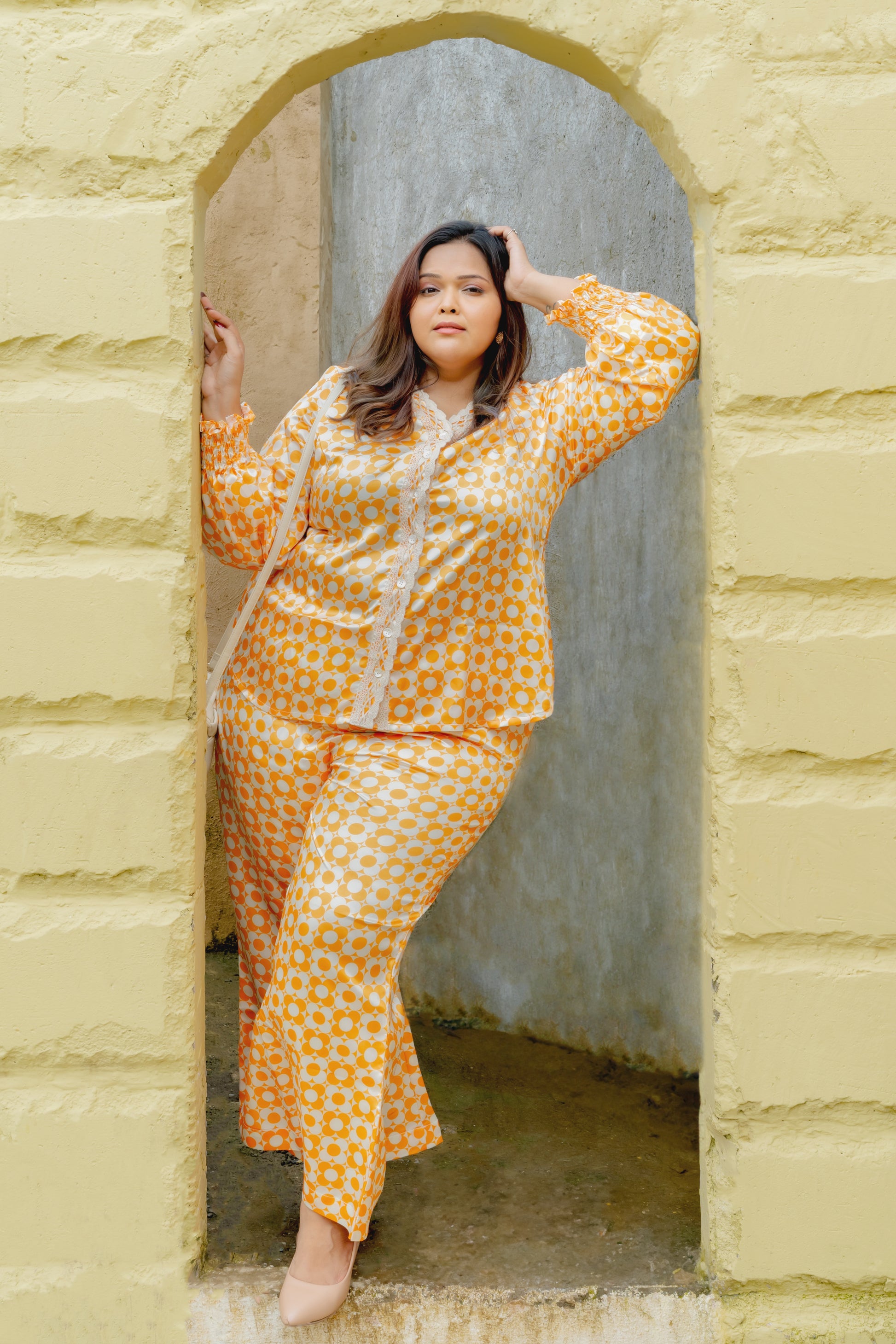 Tangerine and white retro print co-ords with lace and smocking detailing