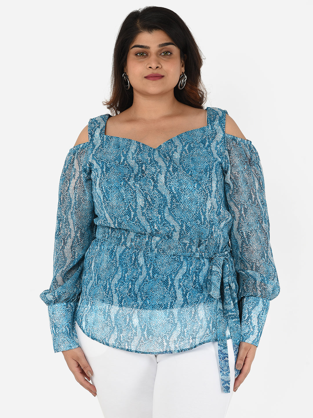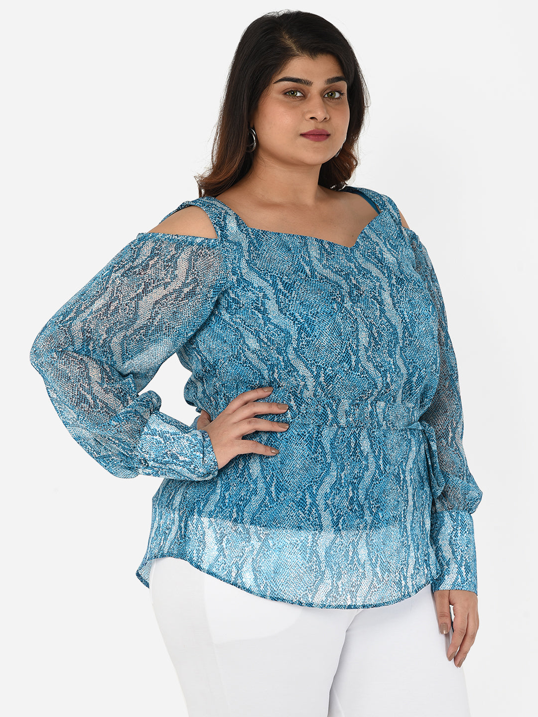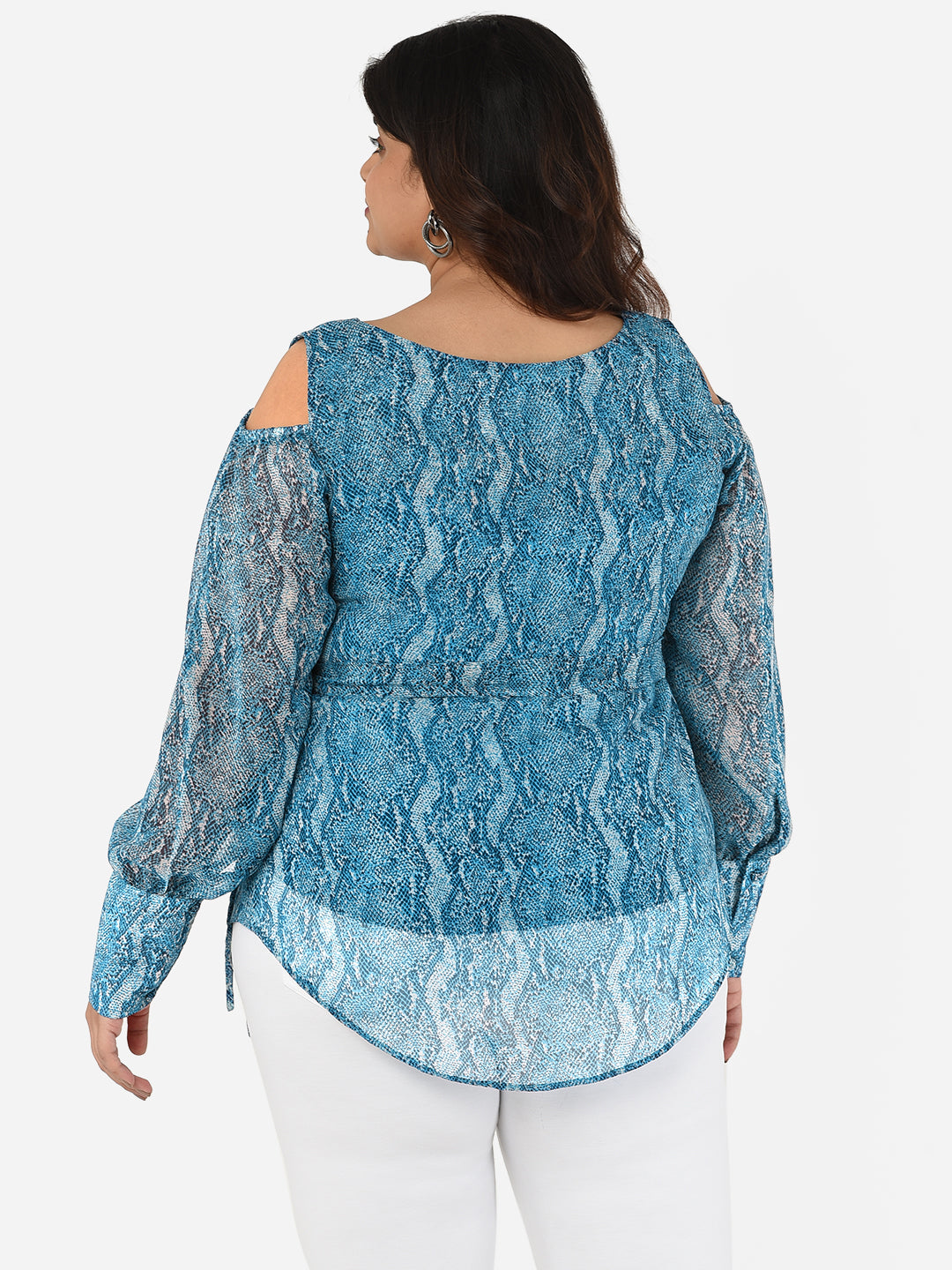 A gorgeous snakeskin print plus size top in blue with cold shoulders, full cuffed sleeves with a matching belt.