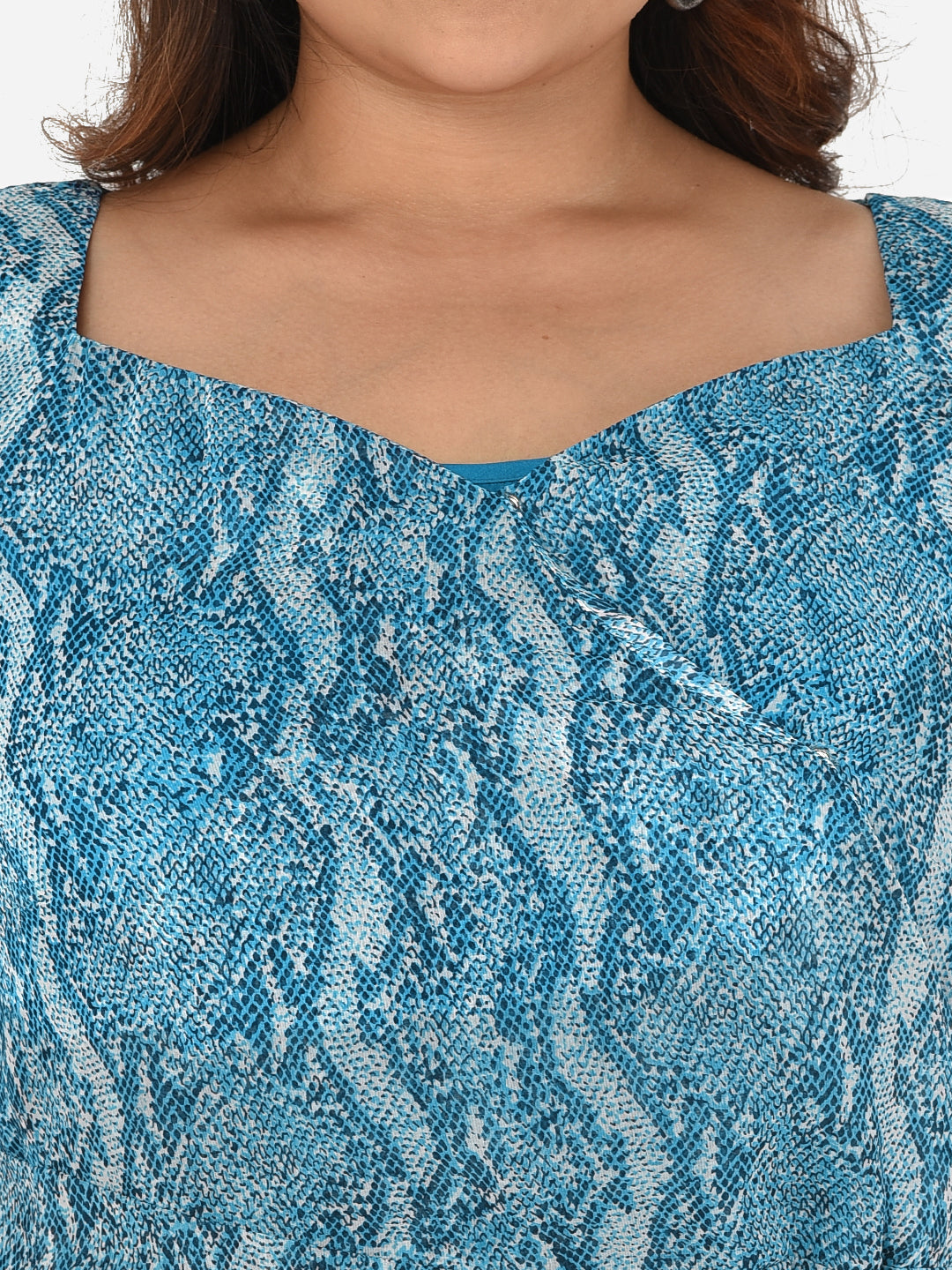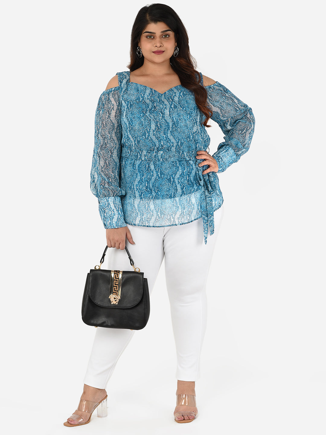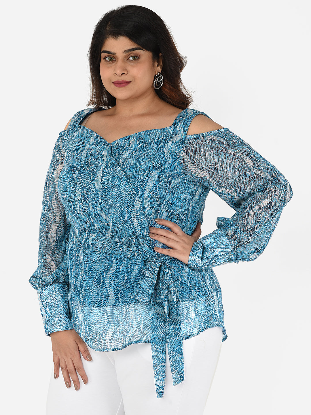 A gorgeous snakeskin print plus size top in blue with cold shoulders, full cuffed sleeves with a matching belt.