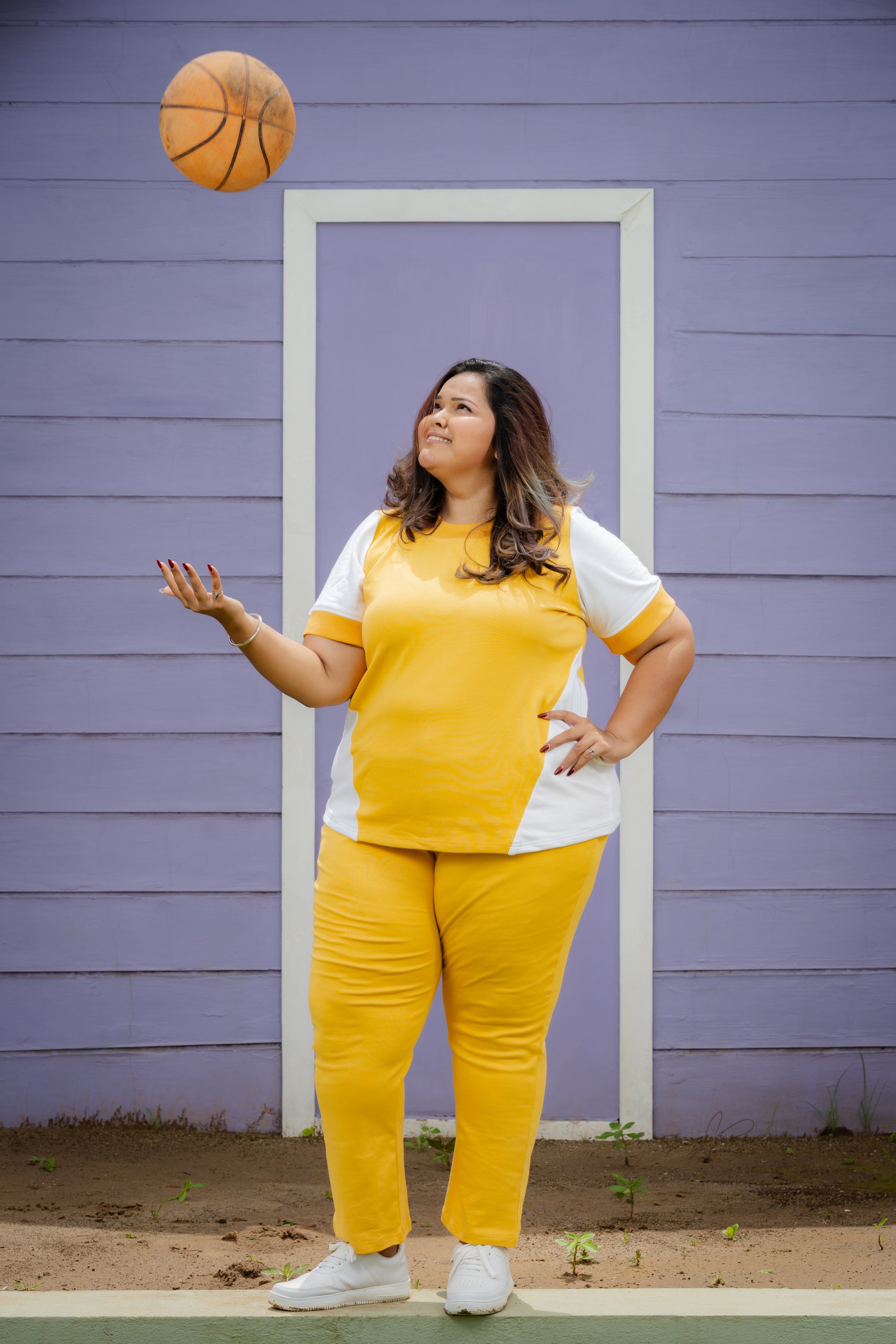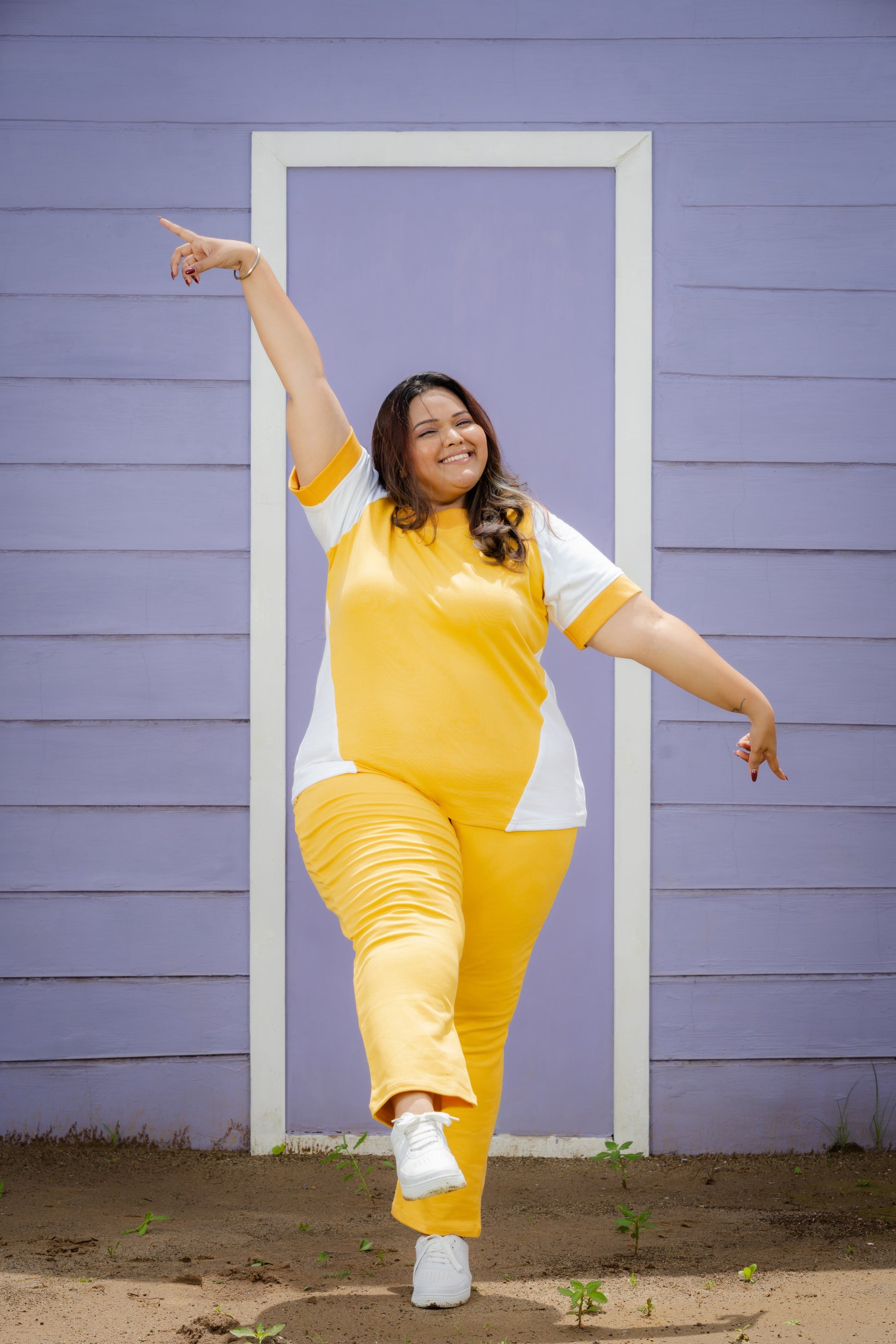 Move all day yellow and white color-blocked tee shirt with straight pants